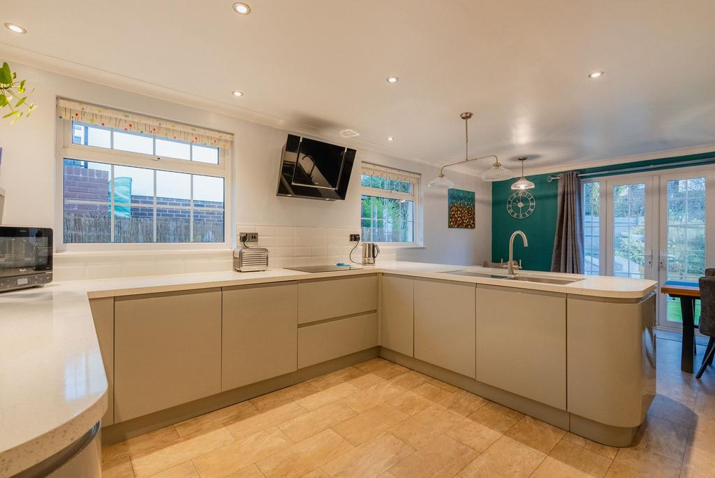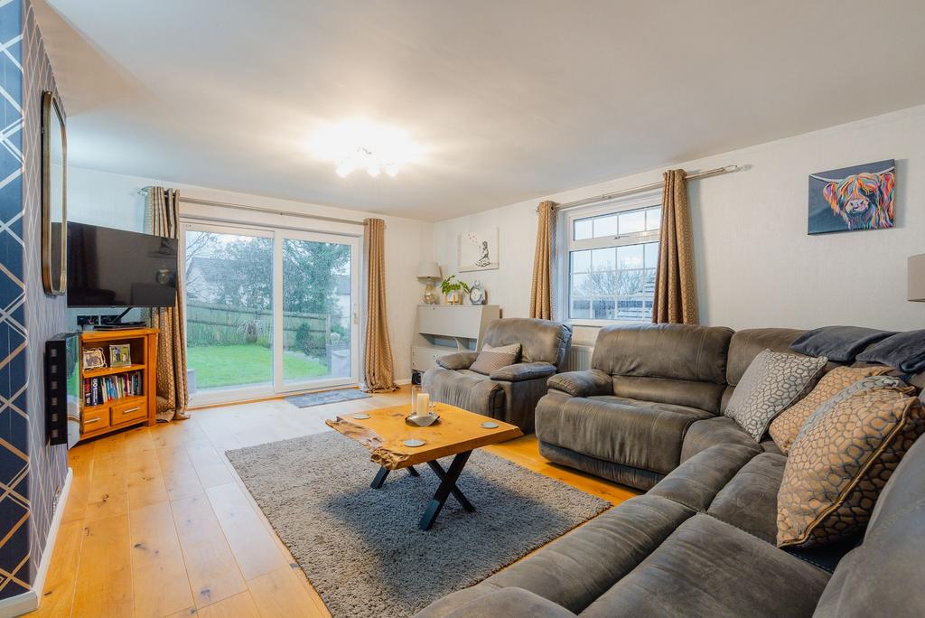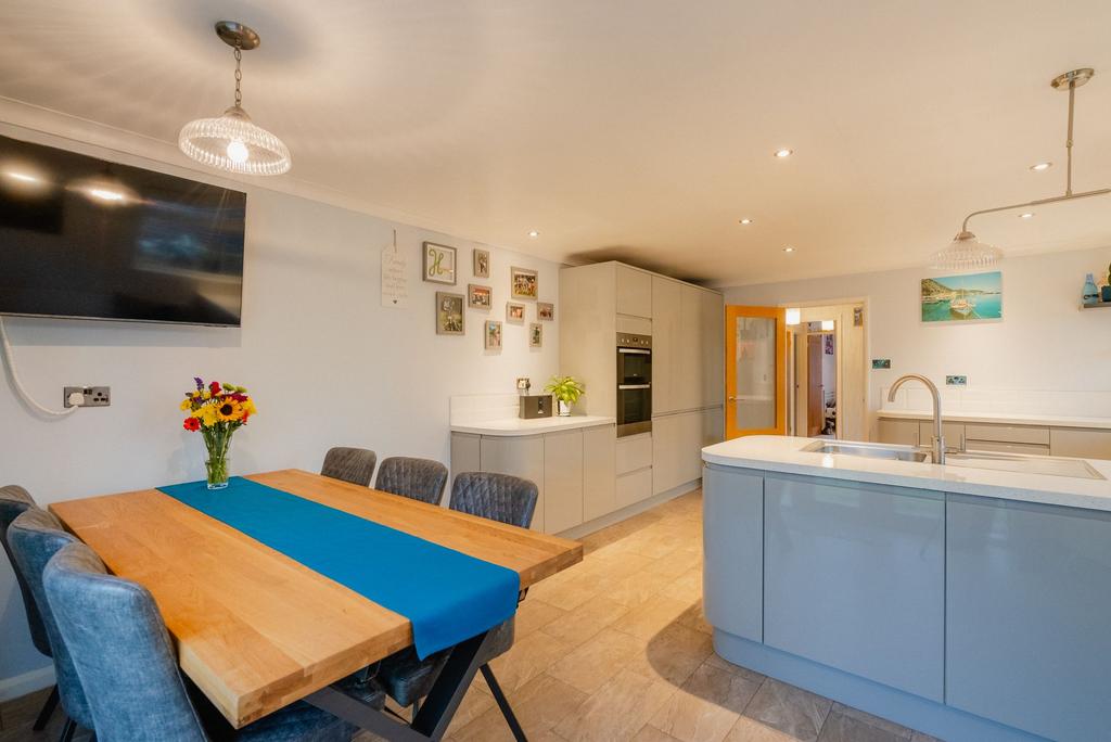 The kitchen has a lovely array of unit space incorporating an integrated fridge/freezer, washing machine, dishwasher and eye level double oven. The units are a modern grey gloss with quartz style worktops and four ring induction hob with stylish extractor over. The dining/sitting area to the end of the kitchen leads out through French doors to the garden. The light and spacious lounge with engineered oak flooring is adjacent to the kitchen and also has the benefit of doors leading out to the garden. The master bedroom enjoys views over the countryside and has plenty of space for wardrobes and includes an ensuite with shower, WC and vanity sink along with underfloor heating and sensor lighting. The 2nd bedroom is to the side of the property and is also a good sized double. The 3rd and 4th bedroom are adjoining and to the front of the property enjoying the views. This room was originally one bedroom and could easily be turned back if desired although this space currently works well for 2 separate single bedrooms or a bedroom and office. The family bathroom also has underfloor heating and a white suite bath with shower over, a dual fuel towel rail and vanity unit sink. There is uPVC double glazing throughout and oil fired central heating with modern boiler and tank.