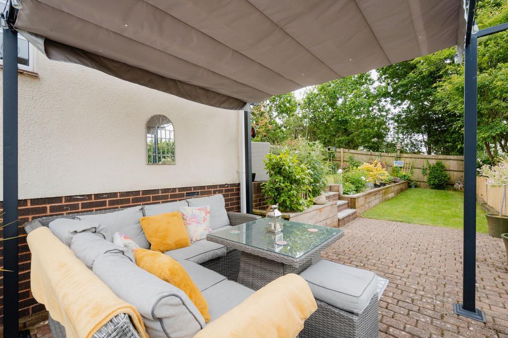 Outside the shared drive with one other property leads from the road into the private section of parking for 4 vehicles and a garage with a rear door to the side patio area. There is a car charging unit and access to the front garden on both sides of the property. The front garden has been well designed with raised beds and patio areas to enjoy outdoor dining along with a side patio area too. The garden is south facing with shrub and flower borders.