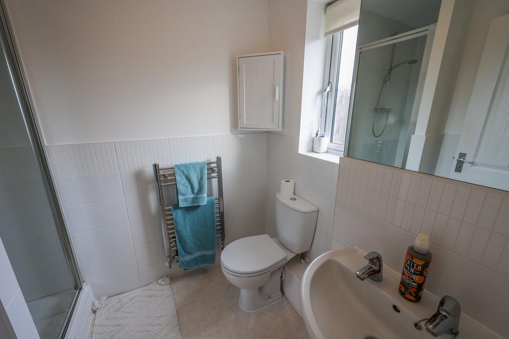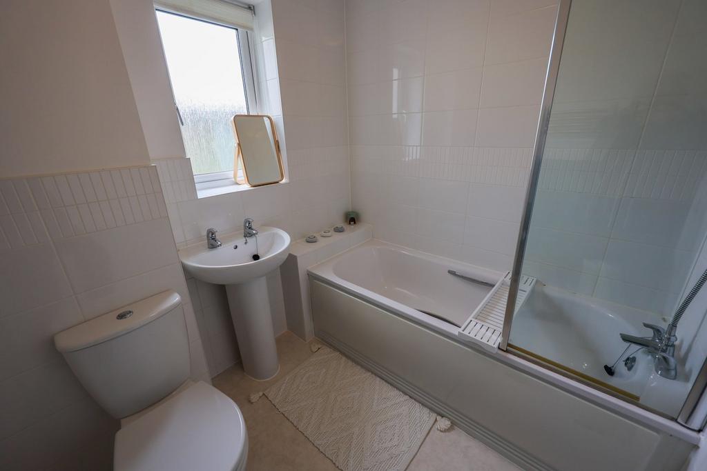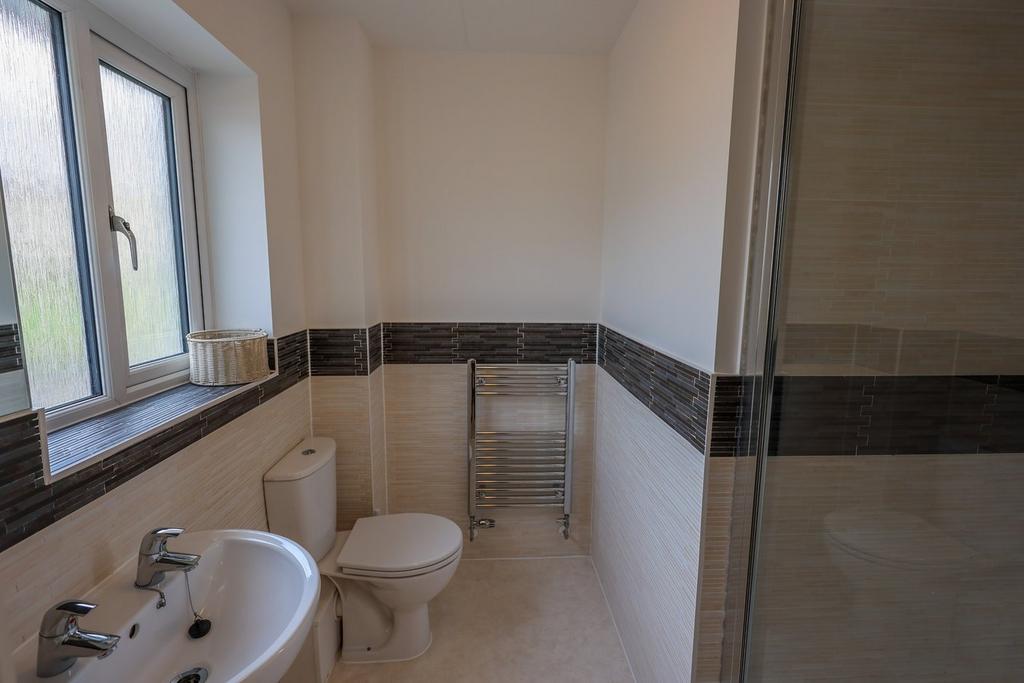 Fitted with a white suite , fully tiled walls, and fully tiled shower cubicle, low level W.C. wash hand basin, extractor fan, window to the front.