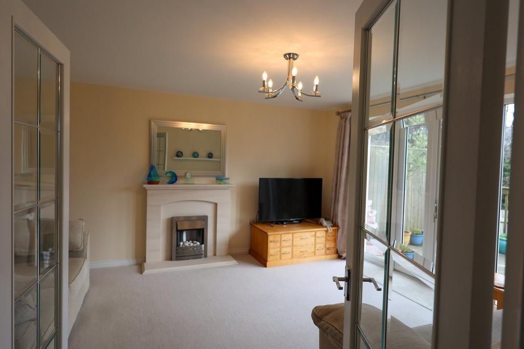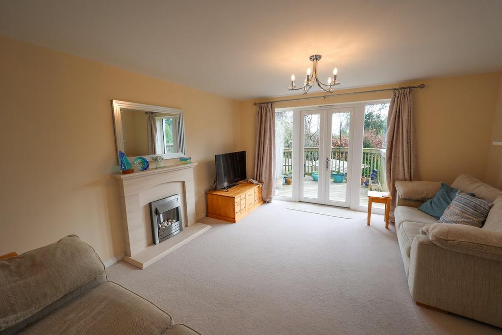 4.5m x 4.5m (14' 9" x 14' 9") max Leaded-effect glazed double doors open into the living room, which features an attractive limestone fireplace and hearth with a pebble-effect electric fire. French doors with a full-glazed side screen lead out to the timber-decked balcony.