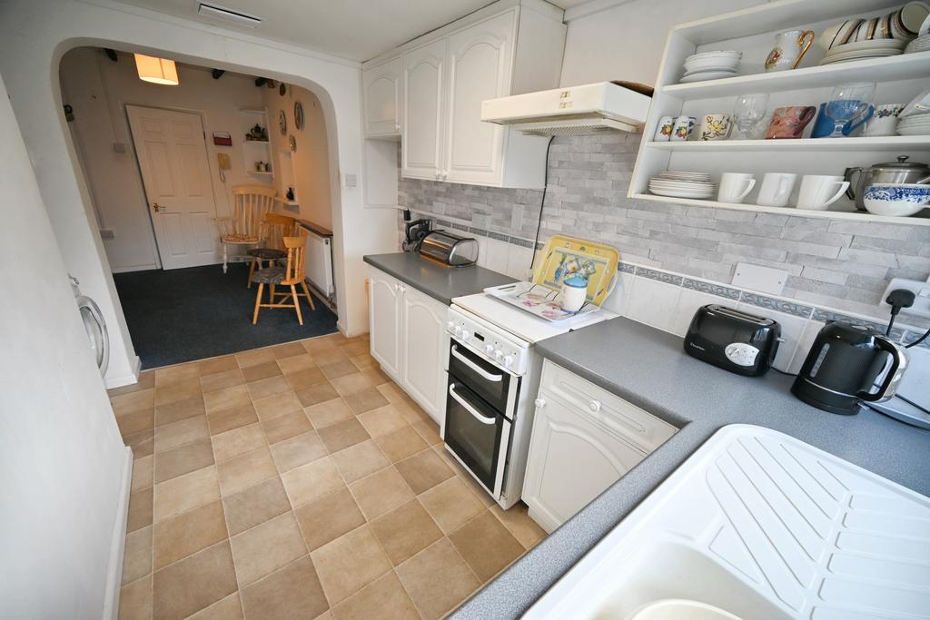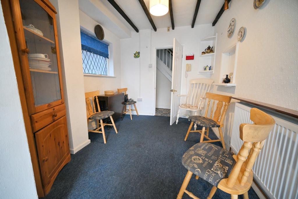 Open Plan Breakfast Room & Kitchen: 22’4” (6.80m) x 9’6” (2.90m) Breakfast room: Radiator, beamed ceiling, double glazed leaded opaque window to side and open archway to: Kitchen: Fitted with a matching suite of white units comprising base cupboards & drawers, single drainer sink unit with matching worktops, suspended wall cupboards, recess & gas point for cooker, plumbing for washing machine, wall mounted gas fired central heating boiler, tiled effect vinyl flooring and glazed window to rear.