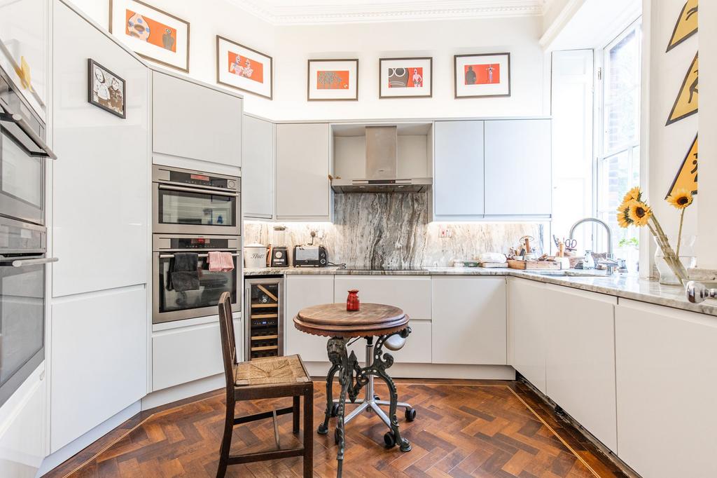 A grand entrance sets the tone for the rest of the property and leads to the drawing room exuding elegance with its high ceilings, intricate period detailing, a striking fireplace, and stunning herringbone flooring.