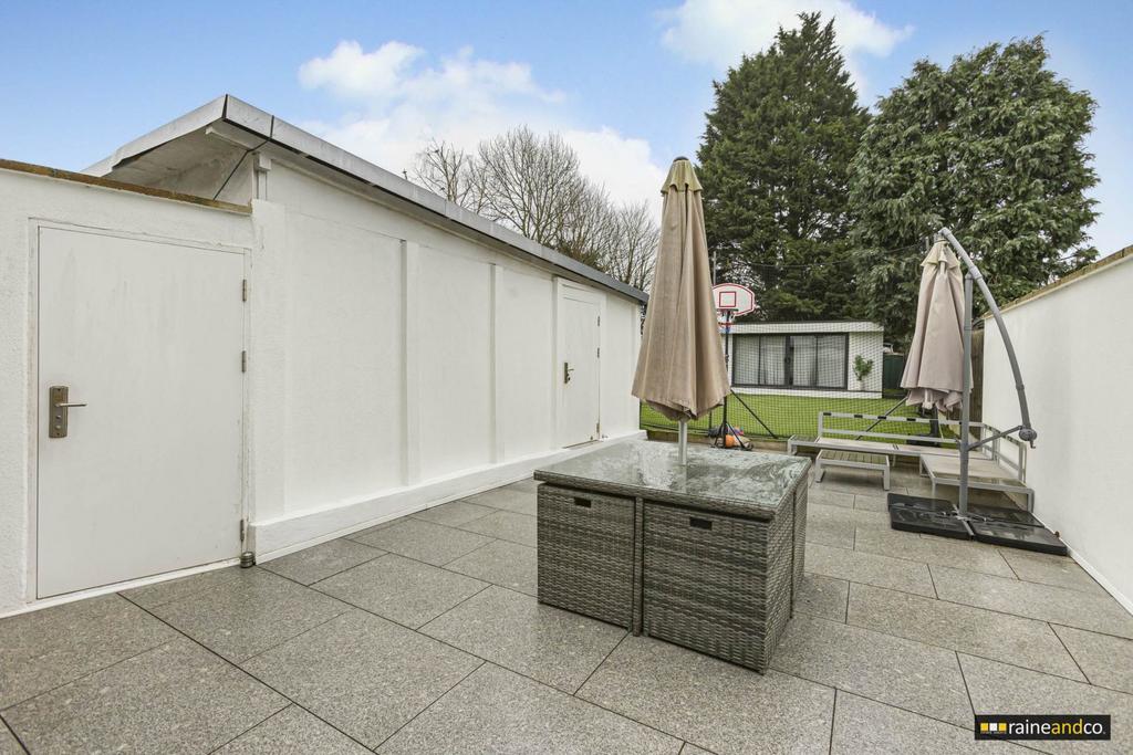 The rear garden is approximately 100ft long, featuring a paved patio area and an artificial lawn for low-maintenance enjoyment. Side pedestrian access connects the garden to the front of the property.