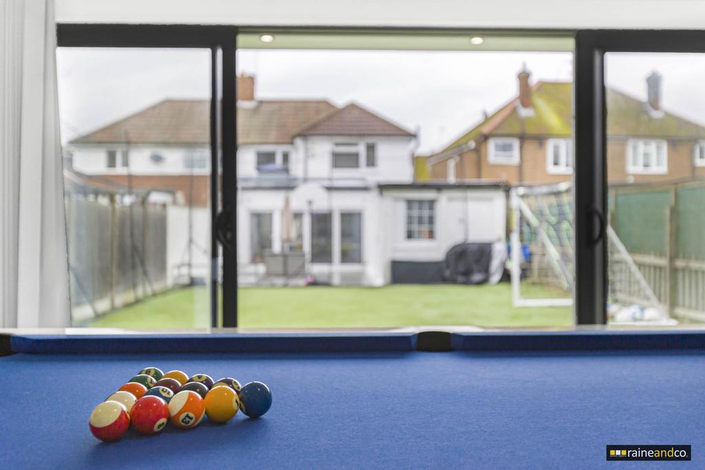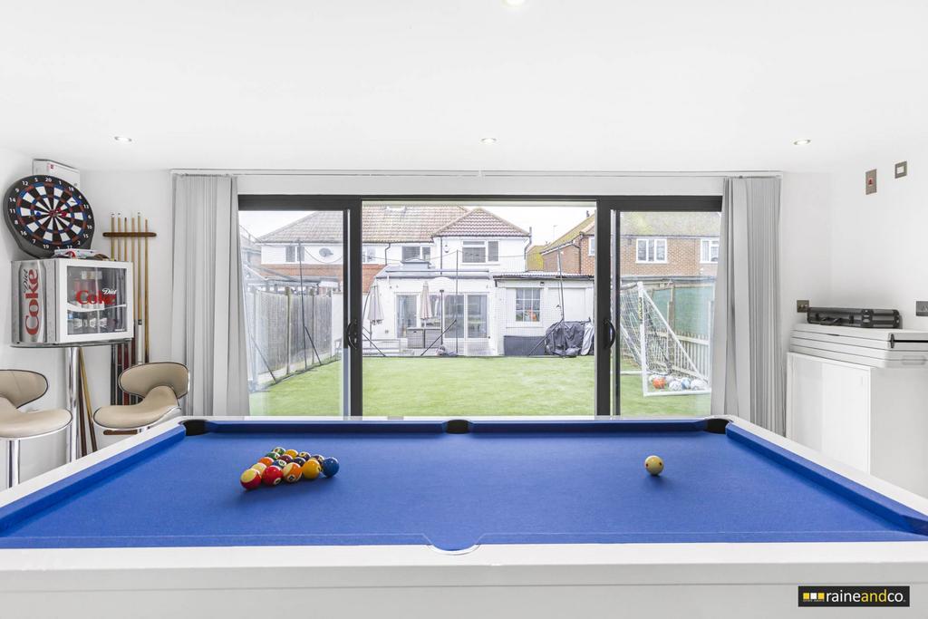Located at the bottom of the garden, the out building/games room is a bright, modern space with sliding doors, laminate flooring, inset spotlights, and a wall-mounted electric heater. The building also includes an ensuite, featuring a walk-in shower cubicle, a wall-mounted wash hand basin, a low-level flush W.C., laminate flooring, and a heated towel rail.
