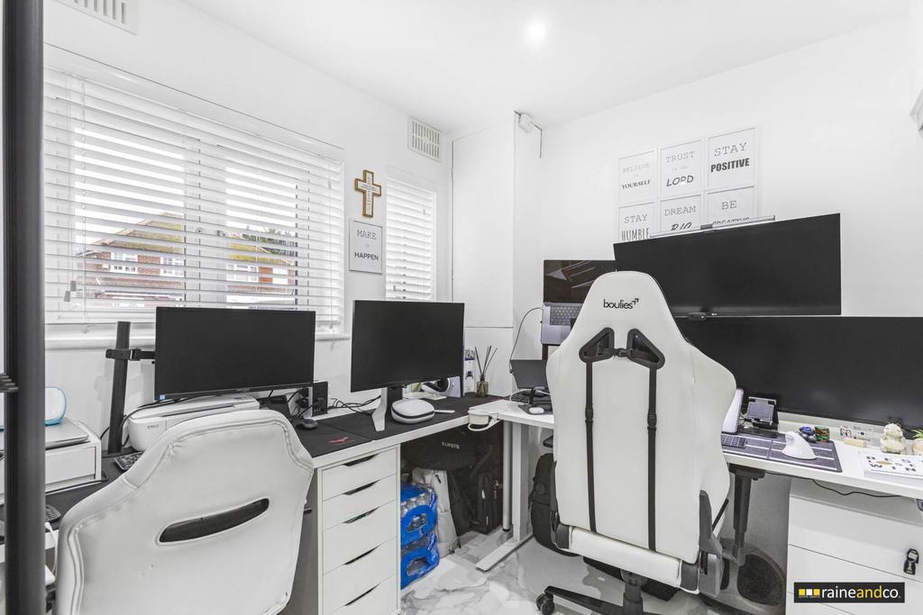 Accessed via frost glass sliding doors from the open-plan area, the study/playroom benefits from a UPVC double-glazed window to the front aspect, providing natural light. A cupboard houses the boiler, while under-stairs storage is available. The room is finished with tiled flooring and power points.