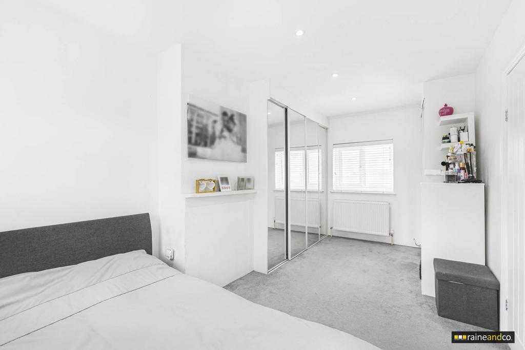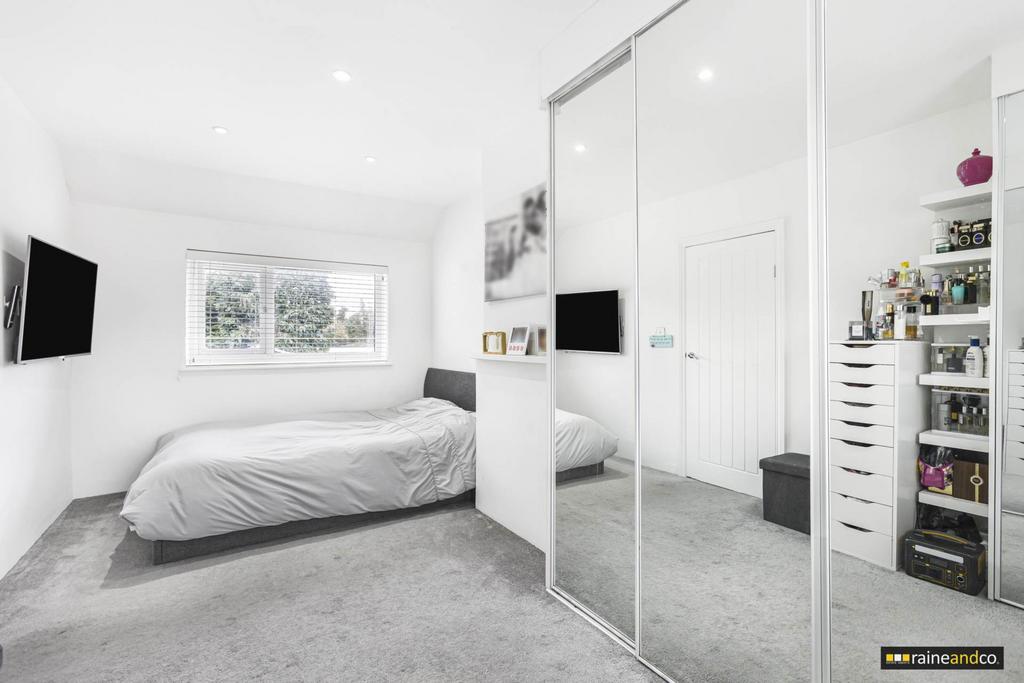 The dual-aspect master bedroom is bright and spacious, with UPVC double-glazed windows to the front and rear aspects. It features a range of fitted wardrobes with mirrored sliding doors, inset spotlights, and a double radiator, offering both style and practicality.