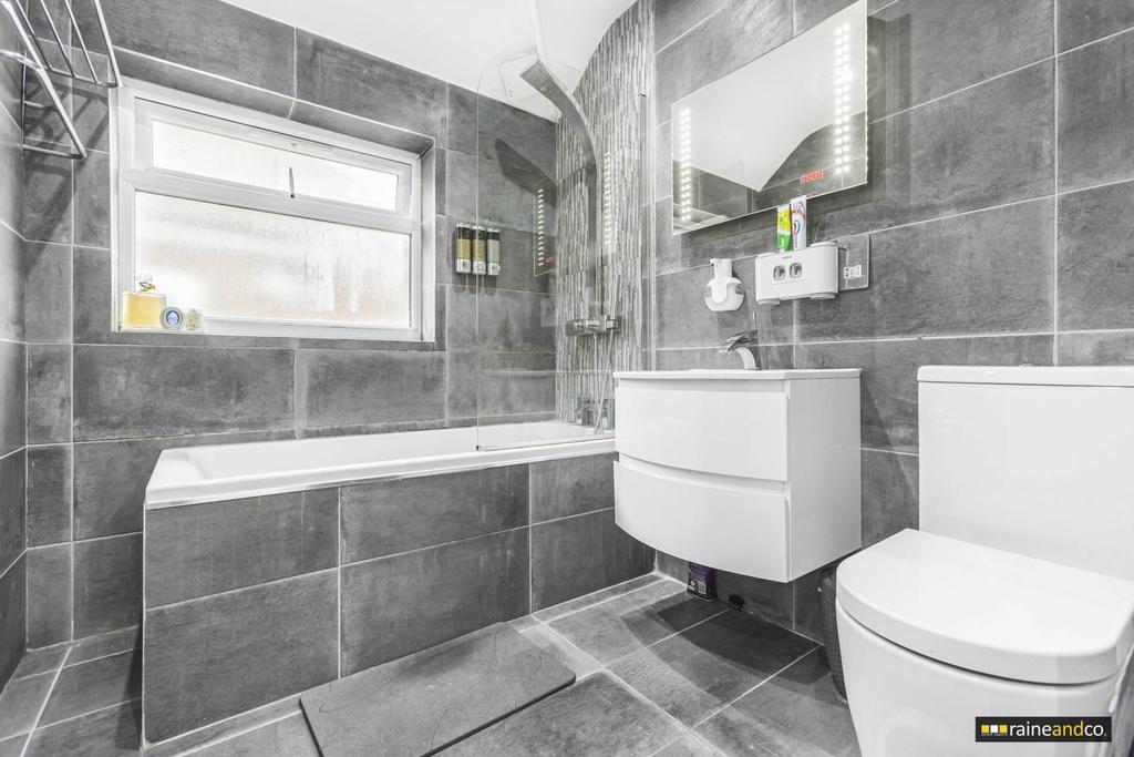 The family bathroom is equipped with a contemporary three-piece suite, including a low-level flush W.C., a wall-mounted wash hand basin with a vanity unit, and a panel-enclosed bath with mixer taps and a rainfall shower attachment. Additional features include a UPVC double-glazed opaque window to the side aspect, fully tiled walls, an extractor fan, a heated towel rail, and inset spotlights.