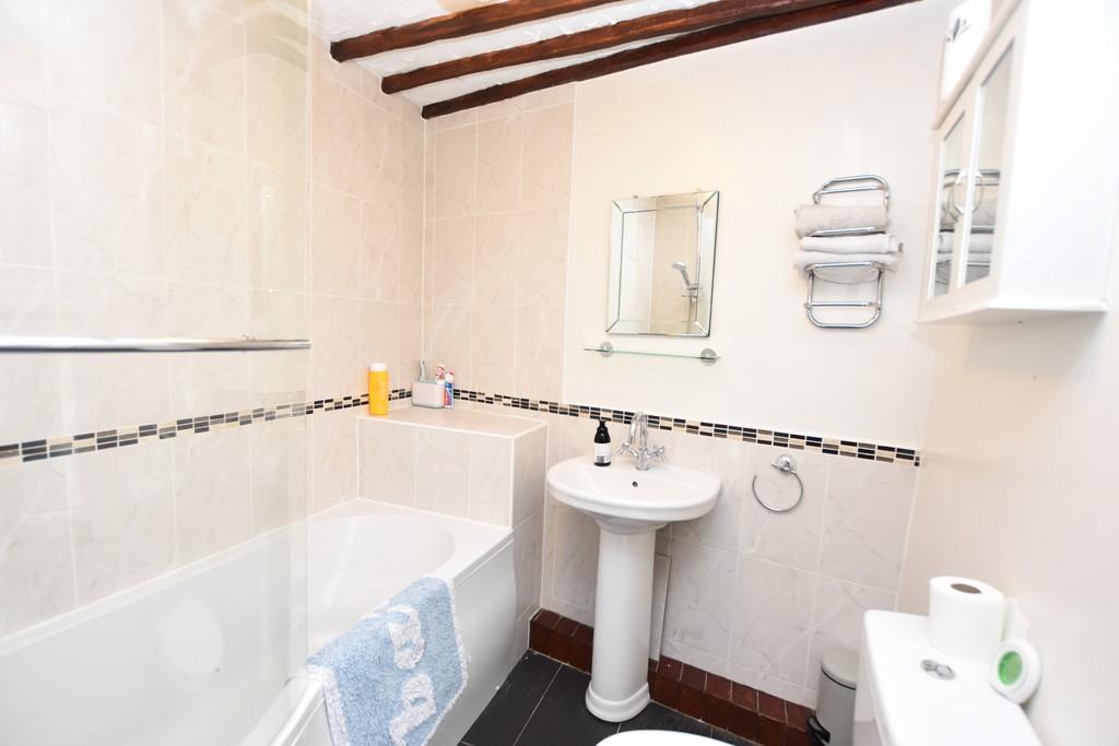 BATHROOM 6' 5" x 6' 3" (1.96m x 1.91m) Modern three piece suite in white comprising of WC with push button flush, pedestal wash hand basin with mixer tap and shower bath with curved shower screen, electric shower and mixer tap fitment. Tiling to splash backs, timber features to wall, ladder style radiator, glass shelf, mirror and bathroom cabinet. UPVC double glazed window with slate sill.