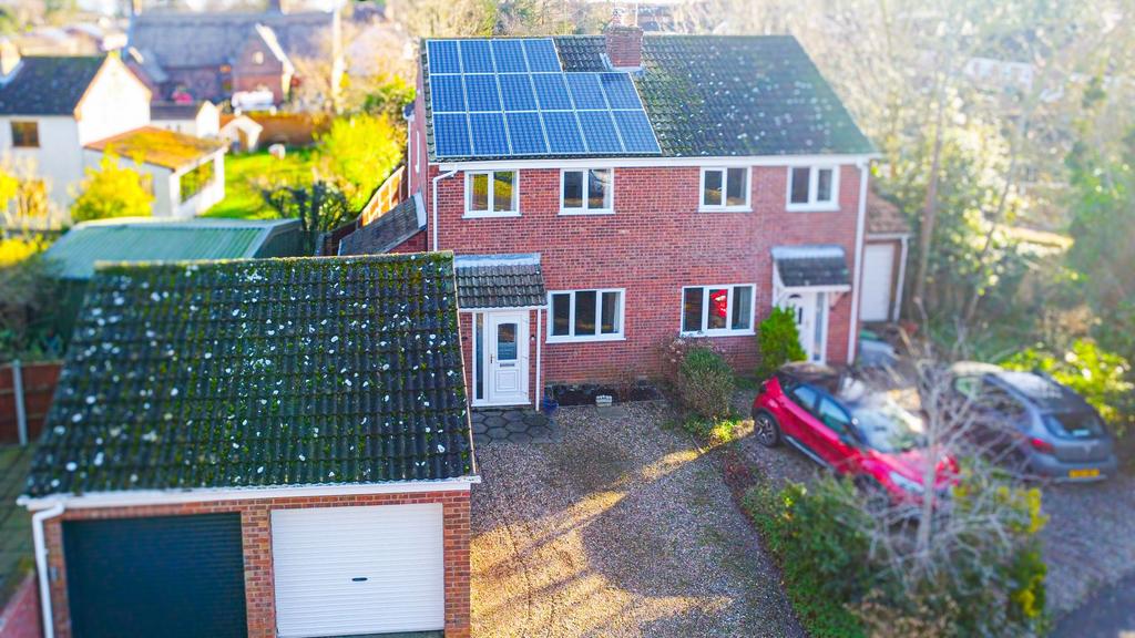 No Onward Chain! - Guide Price £300,000 - £325,000. More spacious than it appears, this semi-detached home seamlessly combines comfort and energy efficiency. The thoughtful extension offers an abundance of room, with modern features and sustainable elements, including solar panels that generate up to £2,000 annually. Inside, the property boasts a large sitting room with a log-burning stove, a stylish kitchen/breakfast area, and four generously sized bedrooms, perfect for family living. Outside, you'll find ample parking, a single garage, and a well-maintained garden with a log cabin summer house, ideal for various uses.