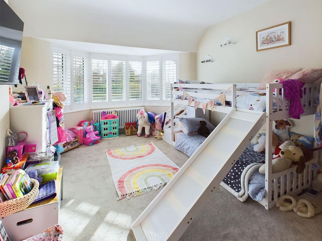 • Wooden flooring and a large bay window with wide wooden shutters flood the room with natural light.