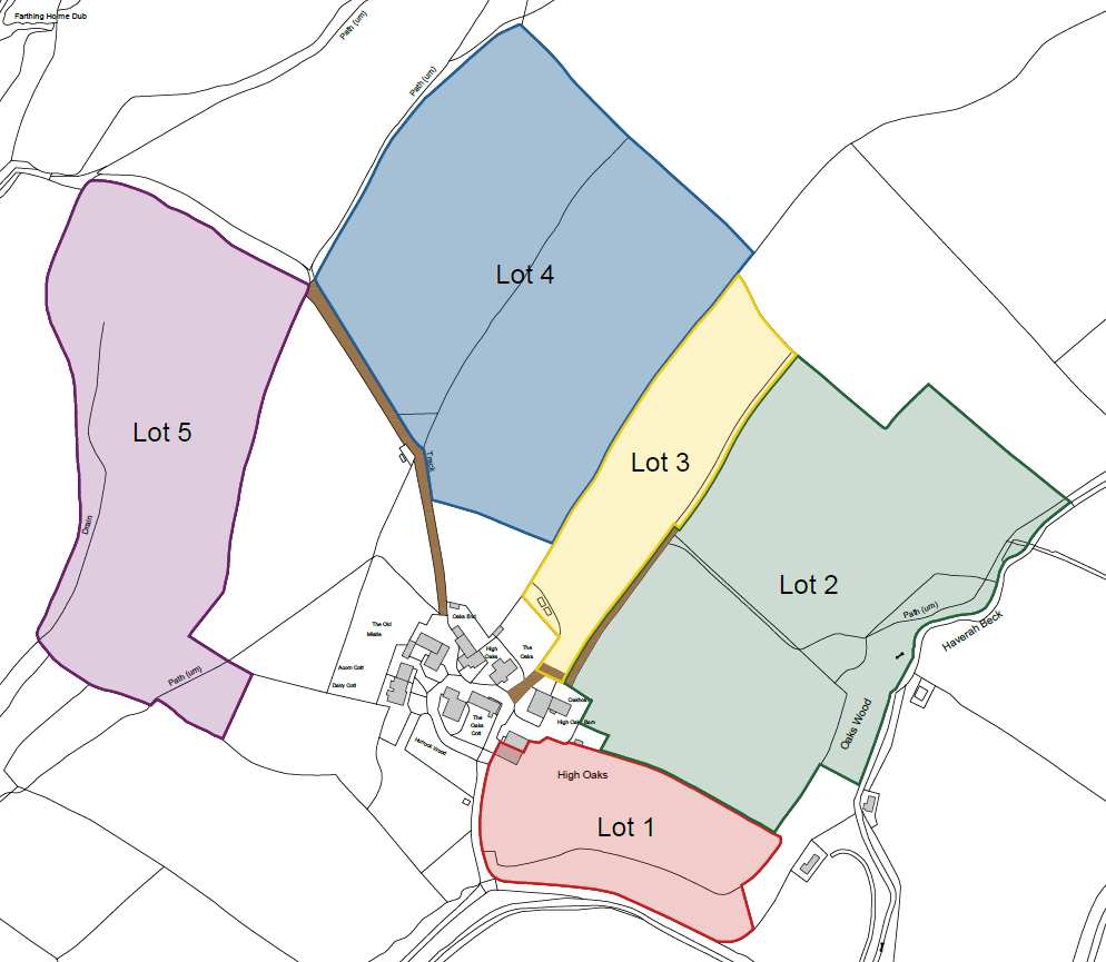 Two manageable parcels bound by fences and hedges. Access to the land is via the track east of 'The Oaks' High Oaks through Lot 3 as marked on the plan in brown.