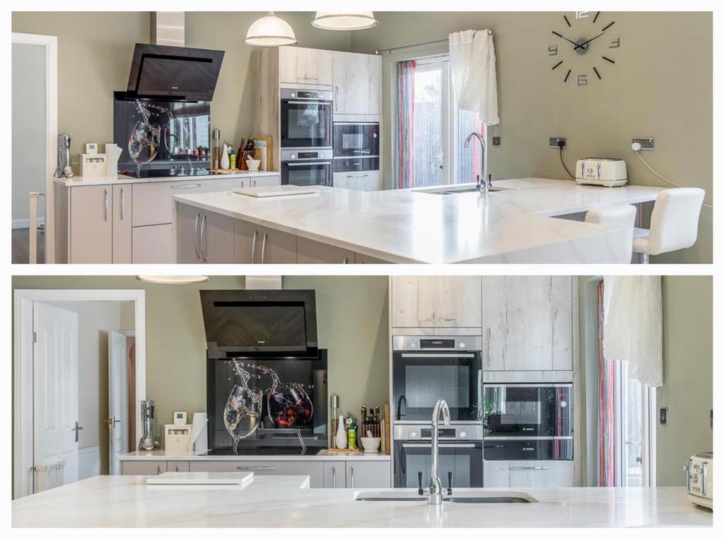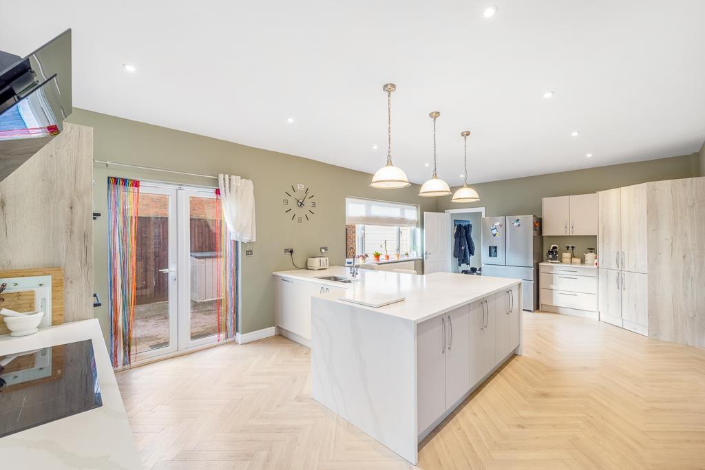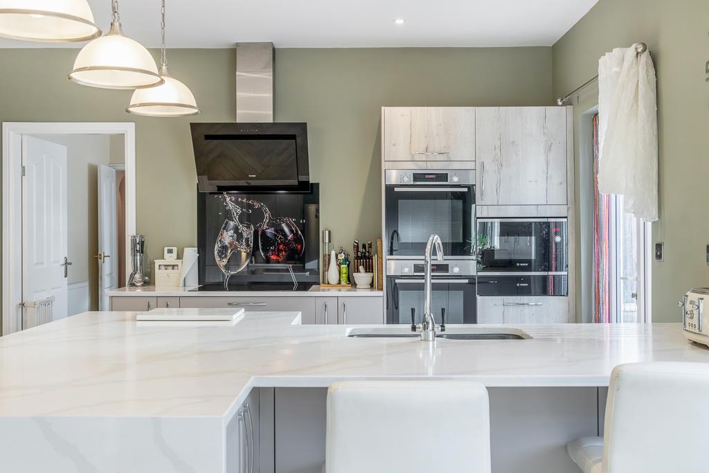 Kitchen - 4.29m x 7.2m (14'0" x 23'7") - PVCu double glazed windows and French doors opening to side. Skimmed ceiling with spotlighting. Two radiators. Herringbone laminate flooring. Doors to living room, dining room and rear lobby. Fitted with a contrasting range of base, eye level and pantry units with granite worktops. Five ring Bosch induction hob with glass splashback and Bosch extractor hood over. Integrated eye level twin ovens and microwave. Integrated dishwasher. Inset stainless steel sink with chrome mixer tap over. Space for American style fridge freezer.