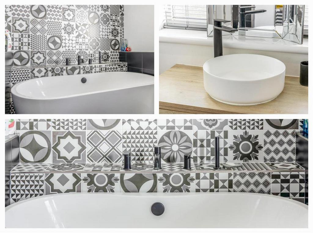 Bathroom - 2m x 3.58m (6'6" x 11'8") - PVCu double glazed window to rear. Skimmed ceiling with spotlighting. Tiled flooring and wall tiling. Wall mounted anthracite heated towel rail. Fitted with a three piece suite comprising freestanding double ended bath with black bath spout, mixer and shower attachment. Wash hand basin set in vanity unit with black mixer tap over and concealed cistern toilet with push button flush. Built in cupboard with shelving and hot water cylinder.