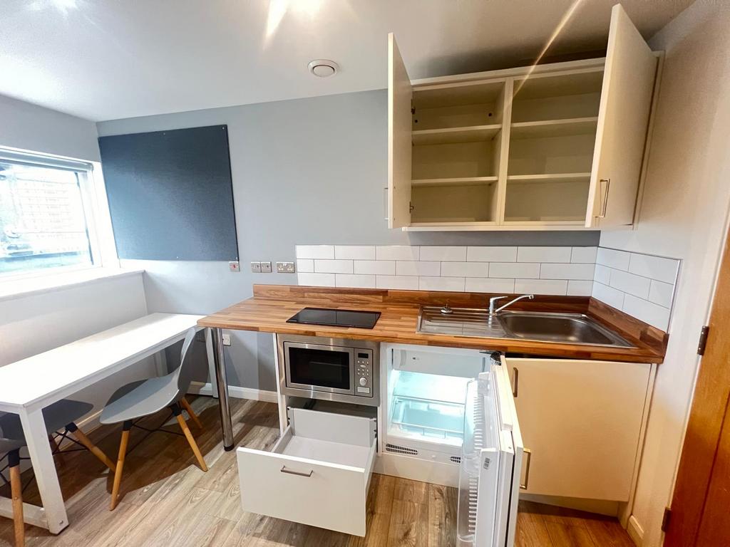 Each studio apartment at Compton House is thoughtfully designed for modern living, featuring contemporary fittings and en-suite facilities. Complete with a single/double bed, study desk, wardrobe, fridge freezer, cooker hobs, and microwave, these studios offer everything you need for a comfortable and functional living space.