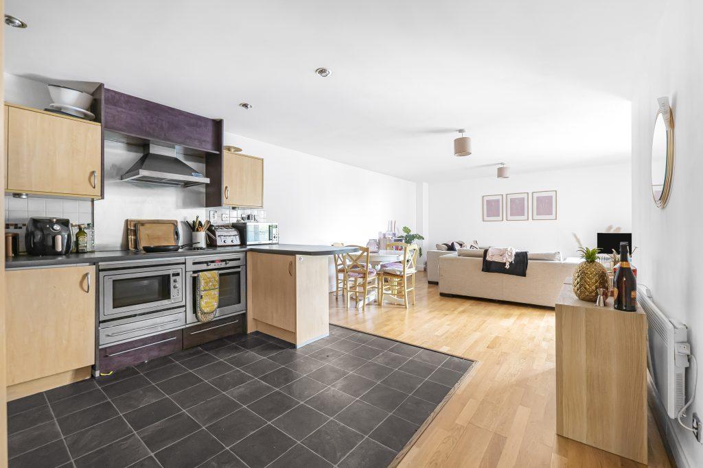 First up is the bright, spacious open plan lounge and kitchen, where the living space stretches to 21' by nearly 17 across, and full height sliding patio doors lead you the generous balcony overlooking the communal grounds.