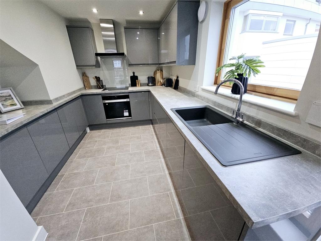 Double glazed window to side and door, luxury range of Grey high gloss base & eye level units with integrated appliances including electric oven, separate induction hob, extractor fan, fridge, freezer & dishwasher. Modern square edge worktops with matching up stands inset sink unit with matching drainer & mixer tap. Tiled floor, extractor fan.