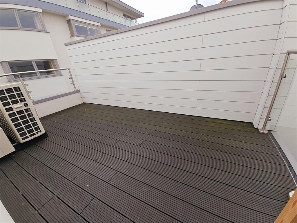West facing terrace with composite decked flooring, stainless steel & glass balustrade, outside lighting and sea views.