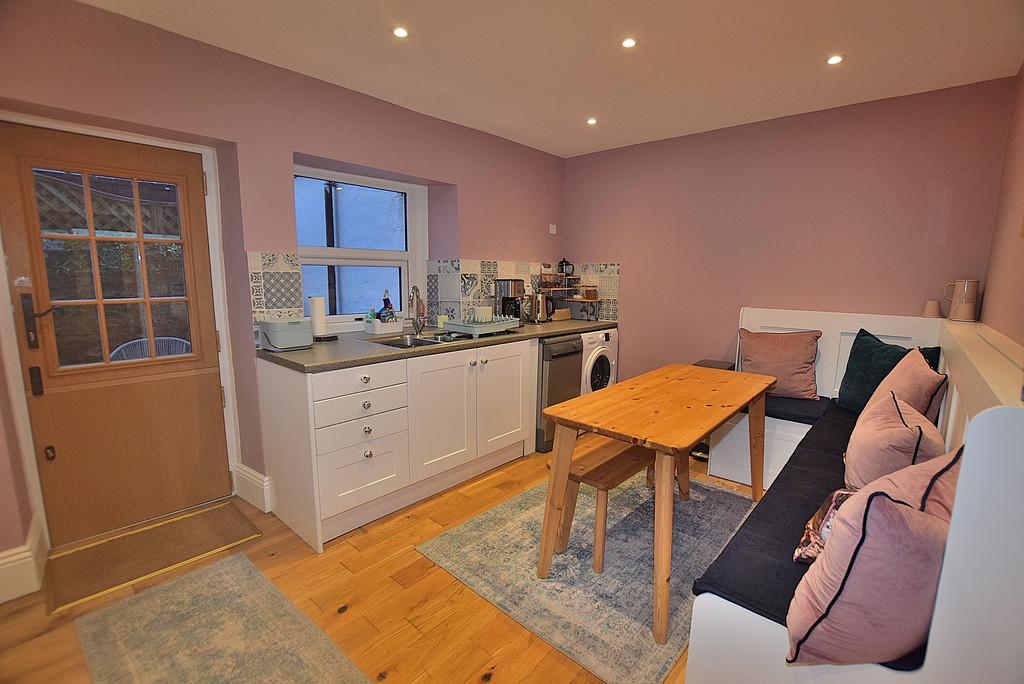 DINING KITCHEN 4.61m x 2.91m With ample space for a table, the kitchen is fitted with a range of modern wall and base units and generous bench seating. There is an electric cooker with an extractor over, a fridge freezer, a dishwasher and a washing machine. There is a upvc double glazed window and a stable style door that opens out to the patio garden.