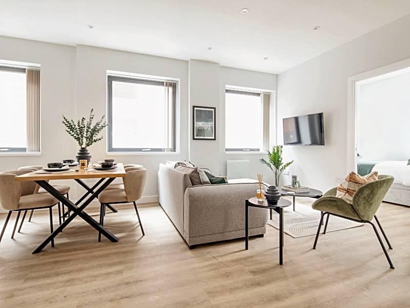 These 3 bedroom apartments are the pearls of our collection. Dive into spacious living, cook up a storm in the kitchen, effortlessly host guests, & savour the moment.. The apartment is fully furnished with bright contemporary design sympathetic to the incredible history of The Anchorage, right on the iconic Salford Quays in Manchester.