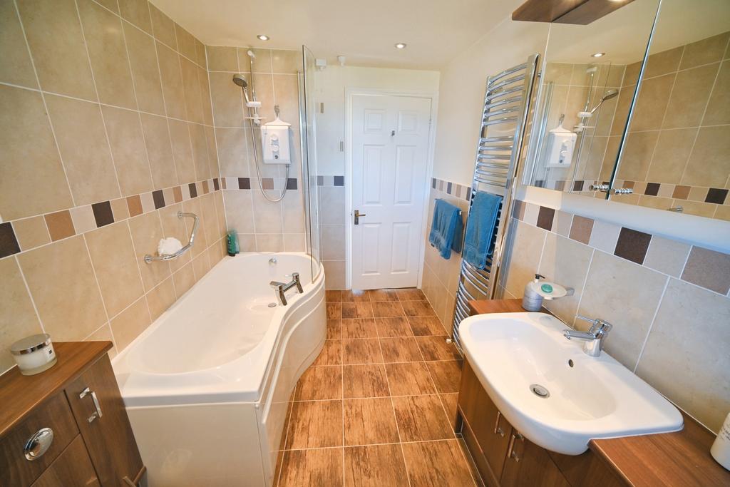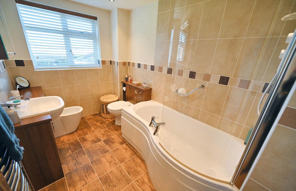 Family Bathroom: 10’6’’ (3.21m) x 6’5’’ (1.96m) Fitted with a luxury white suite comprising P-Shaped panelled bath with electric shower & screen, vanity unit with bidet & storage, recessed WC, mirrored cabinet with spotlighting, chrome heated towel rail, part tiled walls, recessed ceiling spotlights, tiled effect vinyl cushioned flooring and double-glazed window to rear.