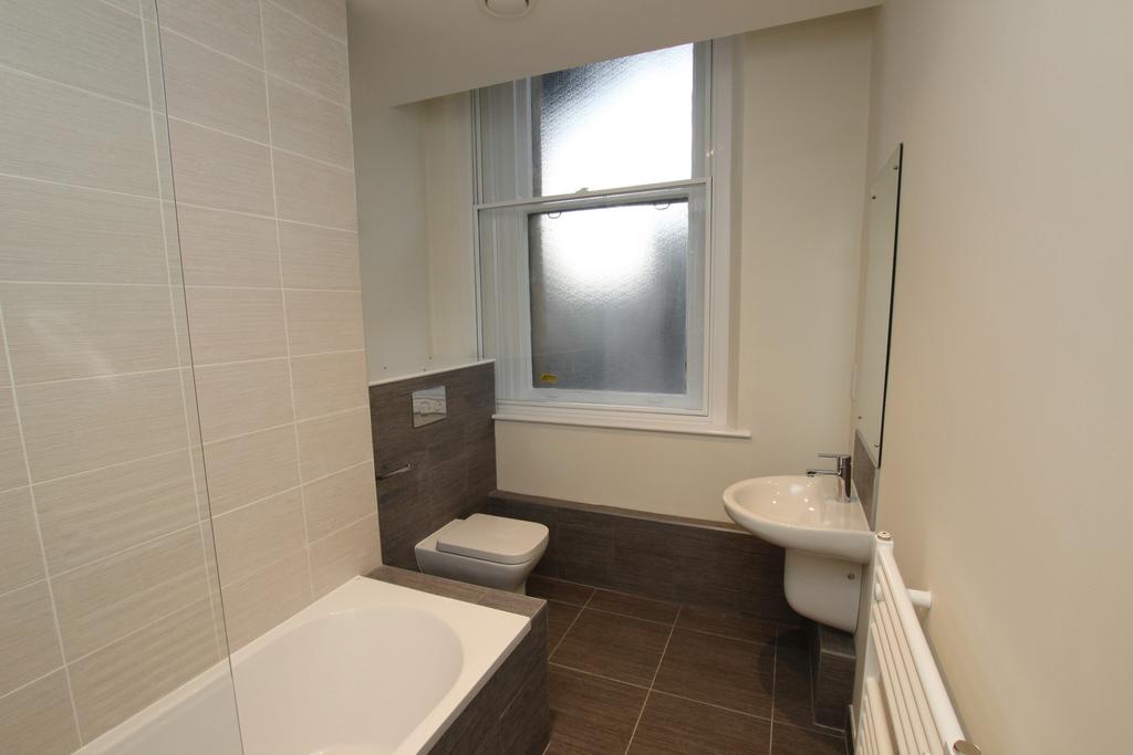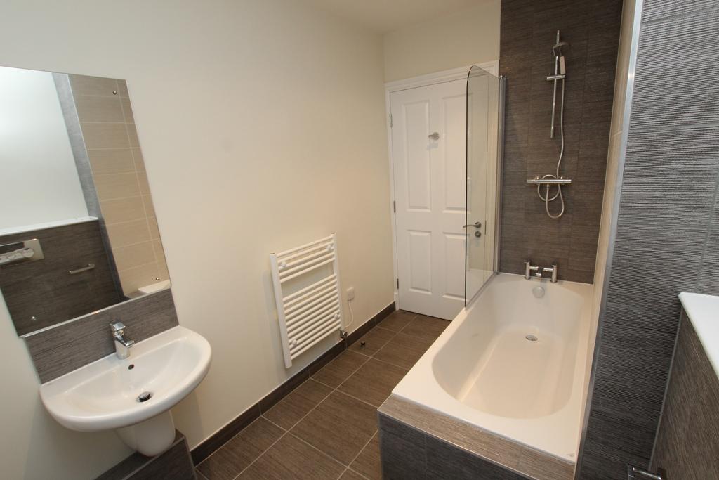 Bathroom: Modern suite with shower over bath, wash basin, low-level WC, and towel rail radiator.