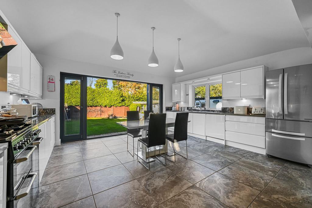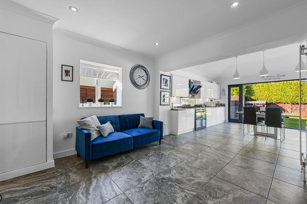 Nestled to the rear of the property is the expansive open-plan kitchen/dining/family room offering a range of base and eye level units, work surfaces, stainless steel sink with mixer tap and drainer, space for range cooker, overhead extractor hood, integral dishwasher, space for fridge/freezer, a combination boiler, tiled flooring and double doors leading to garden.