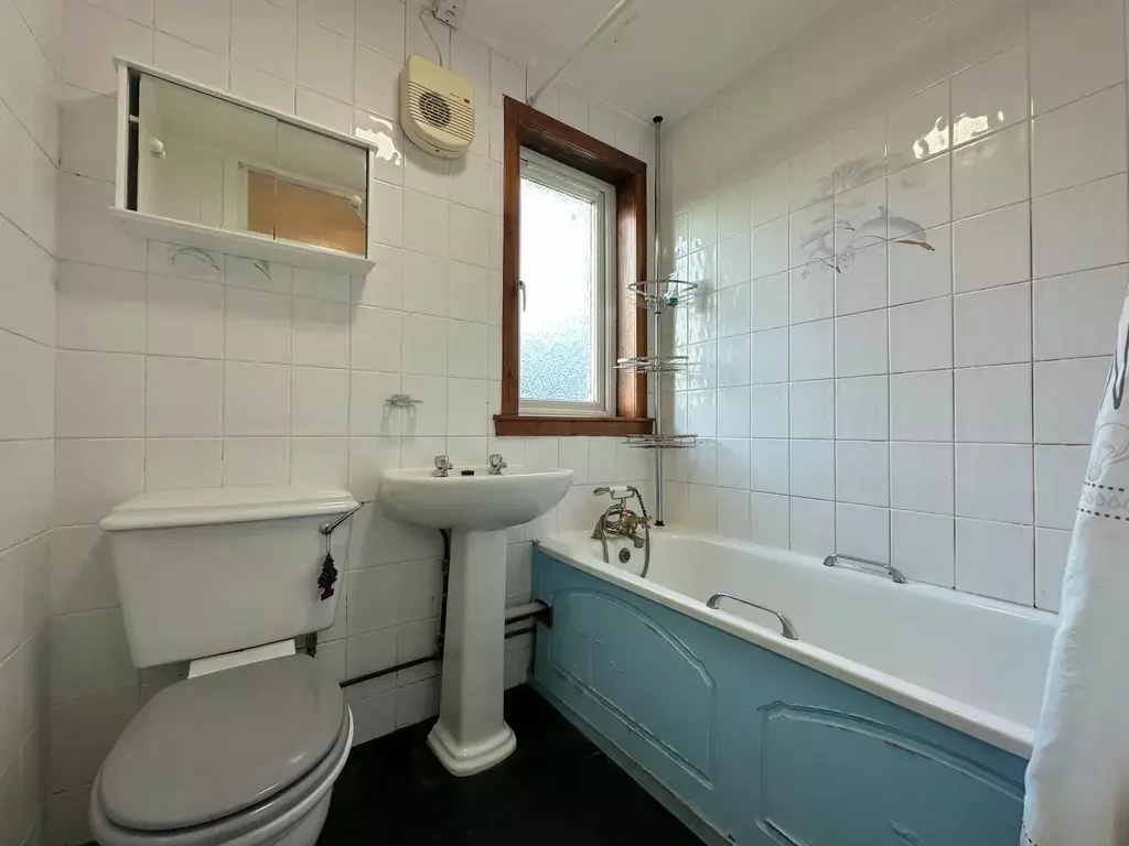 BATHROOM (1.71m x1.98m):- The bathroom is furnished with a WC, wash hand basin, bath, electric shower and a wall mounted vanity unit