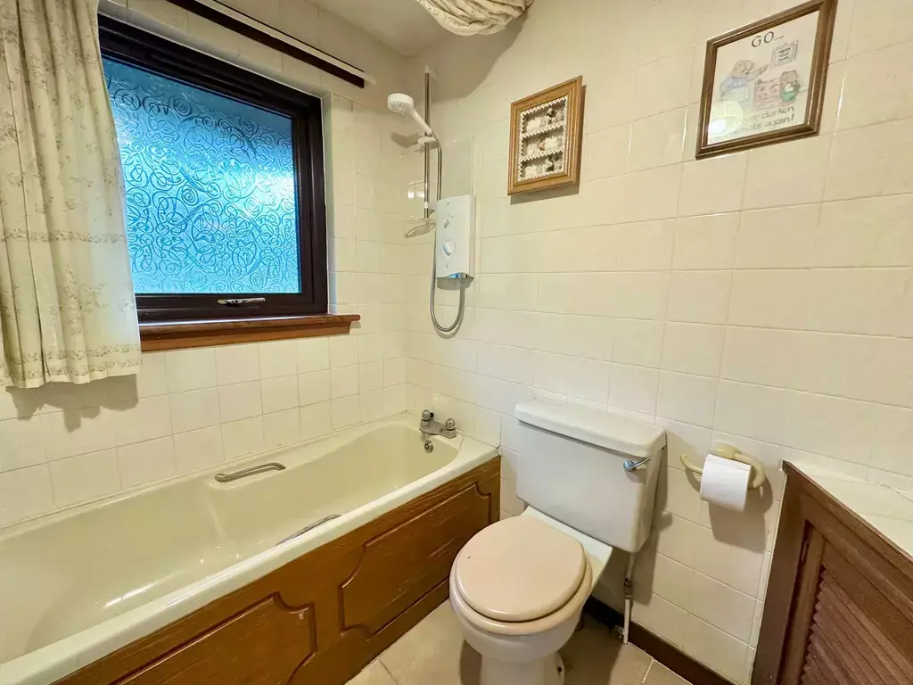 BATHROOM ( 2.32m x 1.68m):- The bathroom is furnished with a WC, wash hand basin with fitted cupboard, bath, electric shower, shaving point and extractor fan.