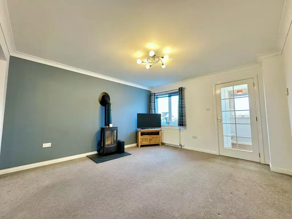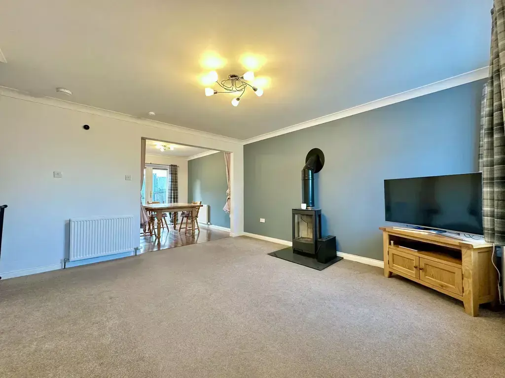 LOUNGE (4.23m x 3.88m):- The bright and spacious lounge is open to the stairs and open plan to the dining room. The wood burning stove resting on a Caithness slate hearth provides a pleasing focal point within the room.