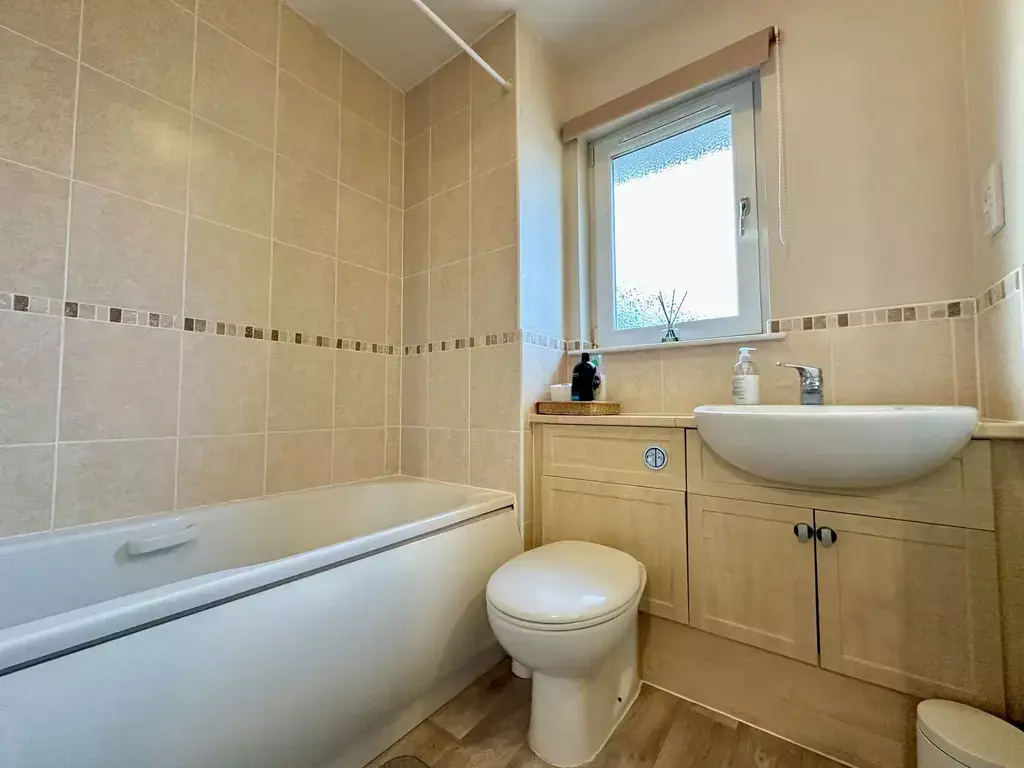 FAMILY BATHROOM (2.05m x 1.92m):- The family bathroom is furnished with a WC, wash hand basin with fitted cupboard, bath, mains fed shower and a shaving point.