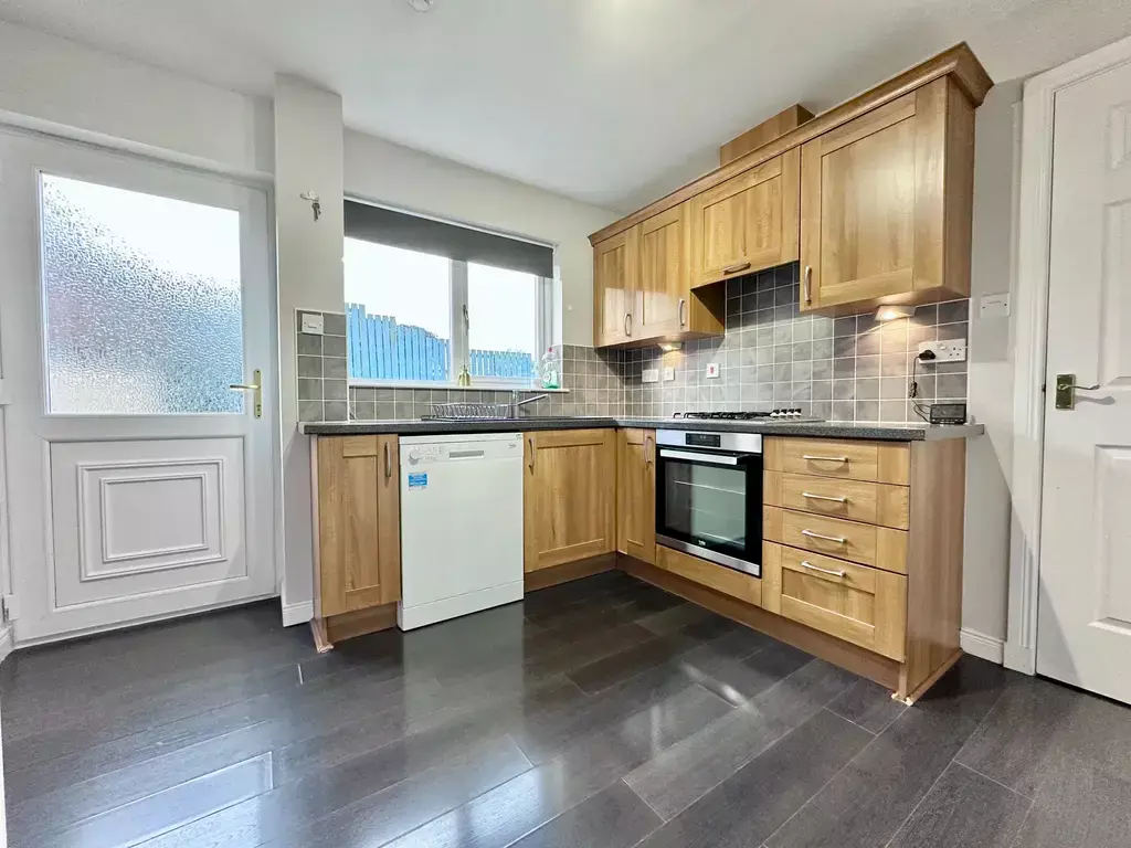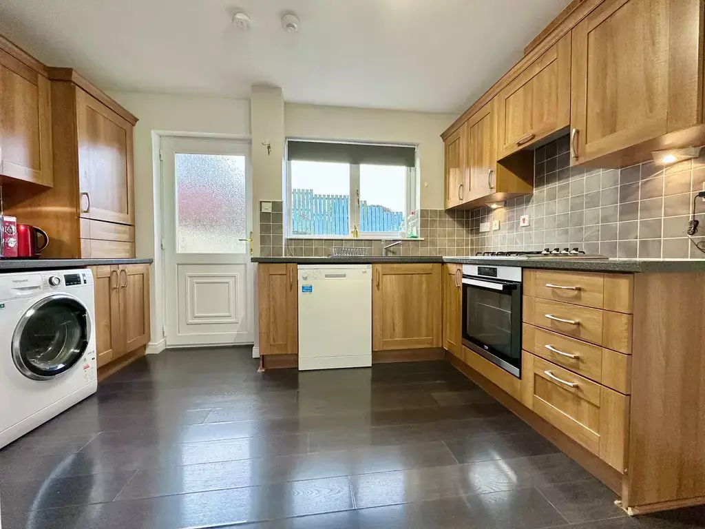 KITCHEN (3.74m x 3.24m):- The modern kitchen is fitted with a combination of wall mounted and floor based units with worktop, one and a half bowl stainless steel sink with drainer, integrated oven, gas hob and extractor hood . Space is offered for a fridge freezer, space for a dishwasher and space for a washing machine. A deep integrated cupboard provides an ideal storage space which could be utilised as a pantry. Access is offered to the rear garden.