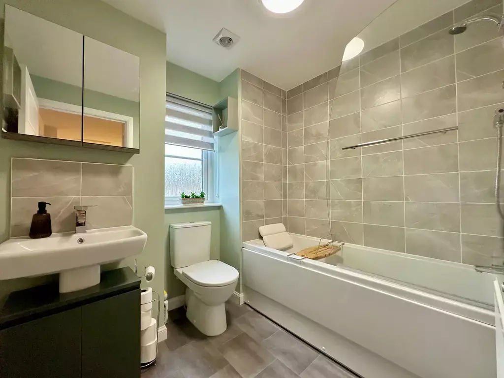 FAMILY BATHROOM (2.04m x 2.31m):- The family bathroom is furnished with a WC, wash hand basin with fitted cupboard, wall mounted vanity unit, bath with mains fed shower and an extractor fan.