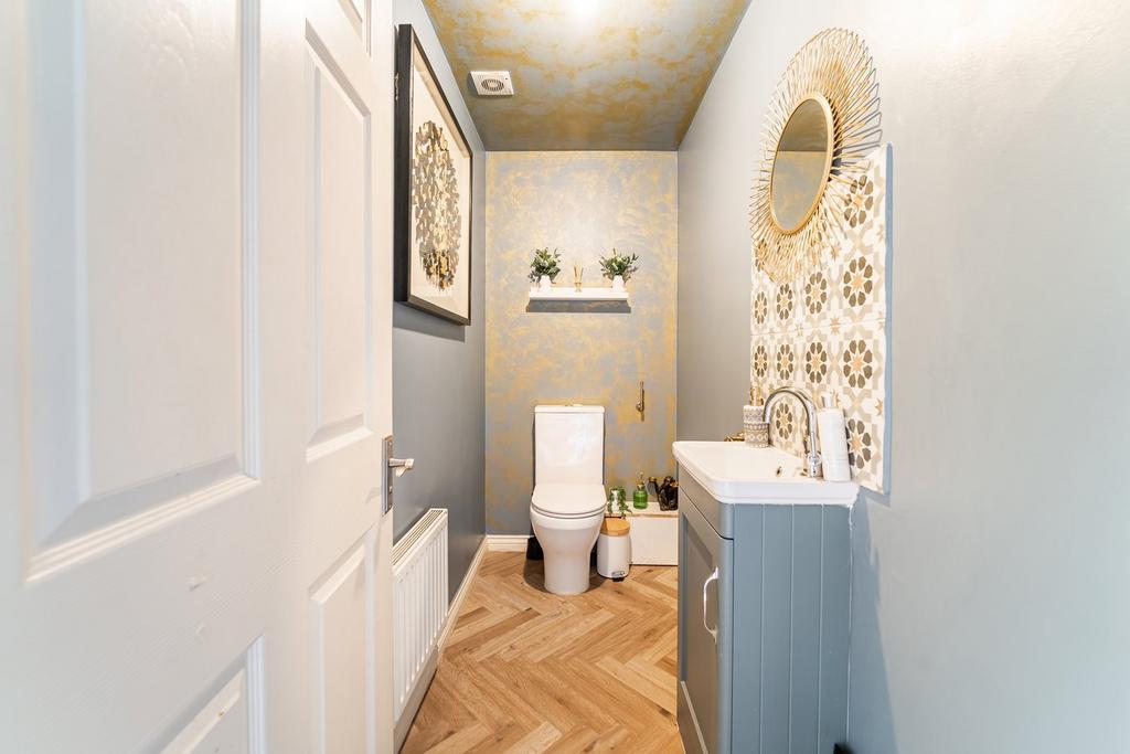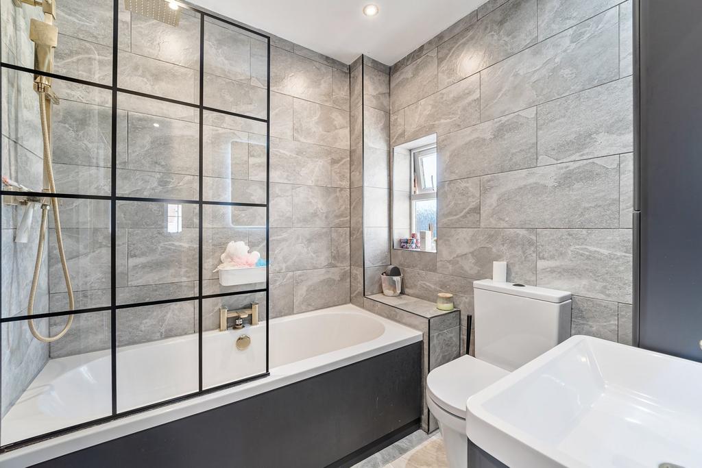 6' 6" x 6' 6" (1.98m x 1.98m) Beautiful fitted bathroom with UPVC double glazed obscure window to side aspect, bath with shower screen and waterfall shower over, vanity wash hand basin and low level WC, heated towel rail