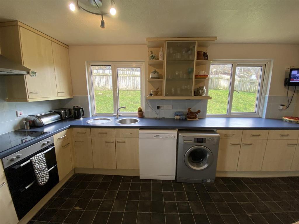 Kitchen - 5.26m x 3.66m - The spacious kitchen is fitted with ample floor based units and wall mounted cupboards all providing good storage and working areas. Inset in the work counter is the circular sink with drainer to the side, electric hob and oven below. There is plumbing for the dishwasher and washing machine. With two windows to the rear, the kitchen is fitted with built in cupboards providing excellent storage. A glazed door leads through to the porch which has a door leading out to the side of the property.