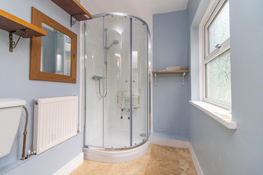 8' 0" x 5' 1" (2.44m x 1.55m) Two piece suite comprising tiled shower cubicle and low level WC, radiator, UPVC sealed double glazed window.