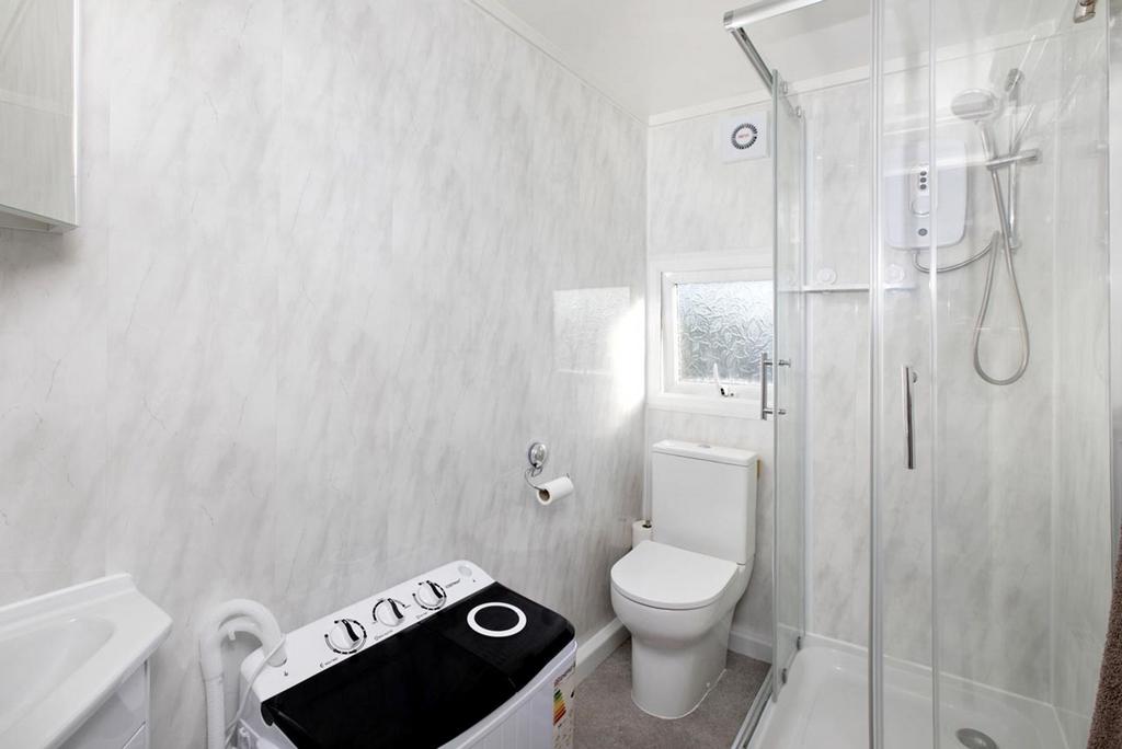 Shower enclosure with sliding glazed door and screen, fitted Triton electric shower ,low level WC, corner wash hand basin set into high gloss vanity unit, uPVC obscure double glazed window, fitted extractor, mirror fronted medicine cabinet, radiator.