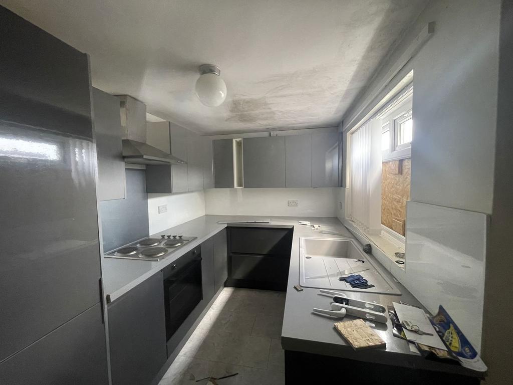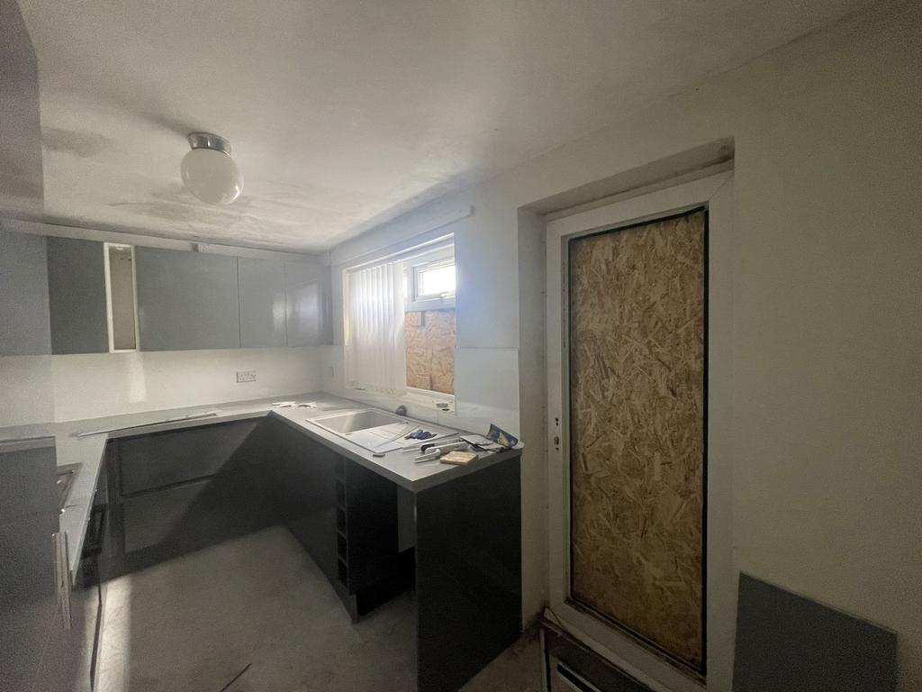 Morden kitchen benefiting from fitted upper and lower units with contrasting square edge worksurfaces, a washing machine and a integrated fridge/freezer. Laminate flooring, UPVC splash back, double glazed rear aspect window and an external door leading to the rear yard.