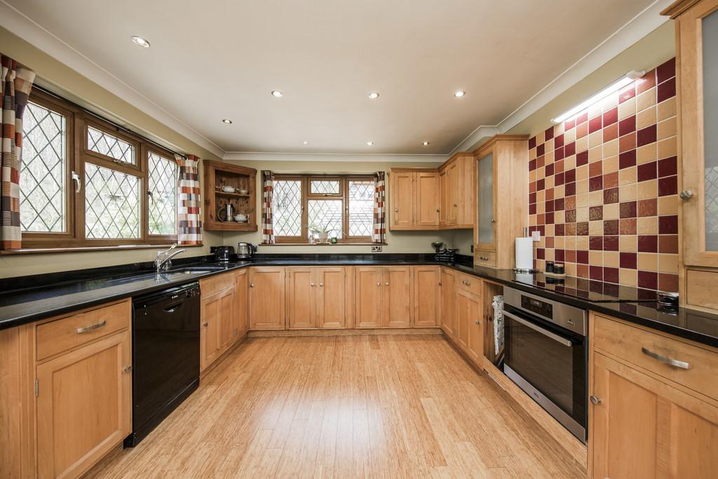 LARGE OPEN PLAN KITCHEN/BREAKFAST ROOM: A contemporary styled kitchen fitted with a range of wooden wall and base units and a complementary polished granite work surface. Inset single bowl sink with mixer tap over. Inset four ring electric hob and integrated 'AEG' electric oven, dishwasher. Space for freestanding fridge/freezer. Good general storage space. Good areas of engineered bamboo flooring, two radiators, cornicing, inset spotlights to the ceiling. Excellent space for a large table and chairs. Triple aspect with leaded style double glazed windows to the front, rear and side affording excellent light levels and views to woods and fields. Partially glazed double glazed door with a leaded finish to the side.