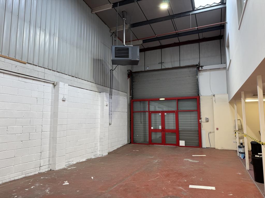Access is by means of a trade counter style frontage which has been formed within the opening of the original vehicular entrance door. There are double leaf glazed entrance doors and an external roller shutter to protect the doors externally. There is also a pedestrian pass door in the front elevation which leads to a fire escape stair to the mezzanine office accommodation.