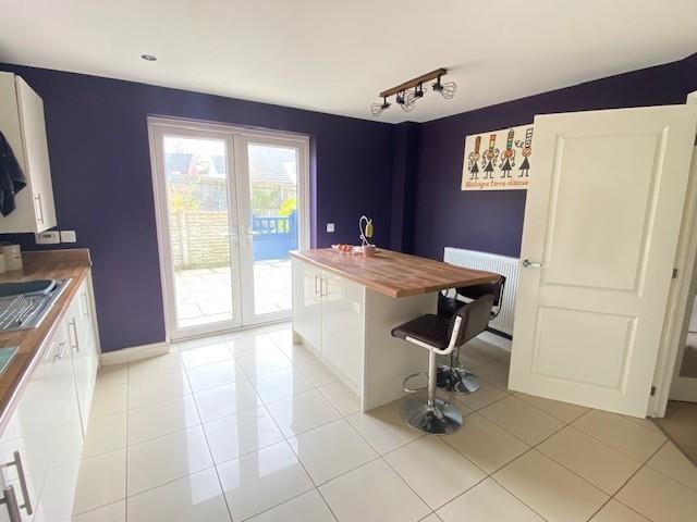Kitchen/Breakfast Room - 4.27m max 3.76m (14'0" max 12'4" ) - L Shaped room and fitted with a good range of wall and base units including a central island and incorporating a 5 Ring gas hob with extractor over, eye level double oven, integral fridge/freezer, washing machine ,dishwasher, pull out spice racks adn a 1.5 bowl single drainer stainless steel sink unit. Wall mounted 'Baxi' gas boiler. French doors opening on to the rear patio, ceramic tiled floor and radiator.