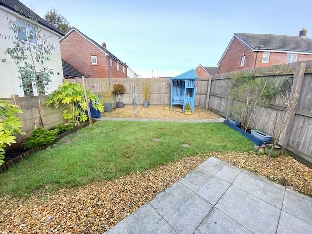 Enclosed rear garden with patio directly to rear and a gated access leads to a garden where there is a lawned area together with areas of decorative stone and a small patio/seating area.