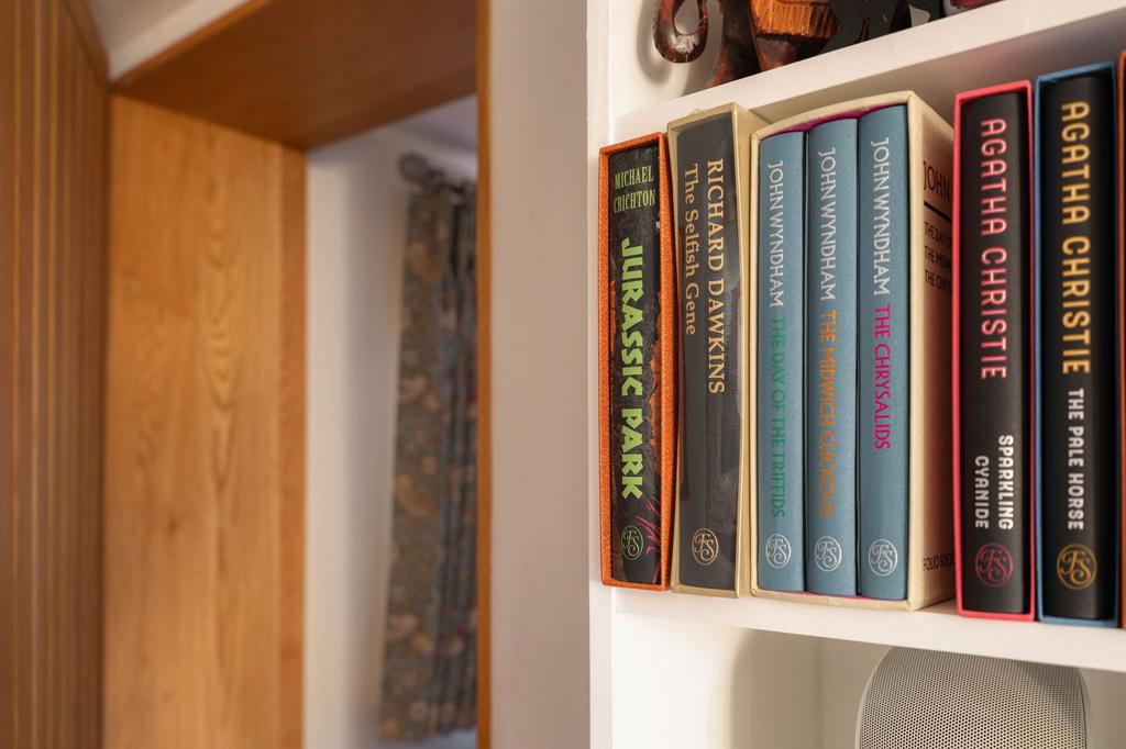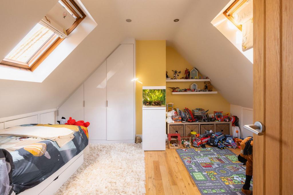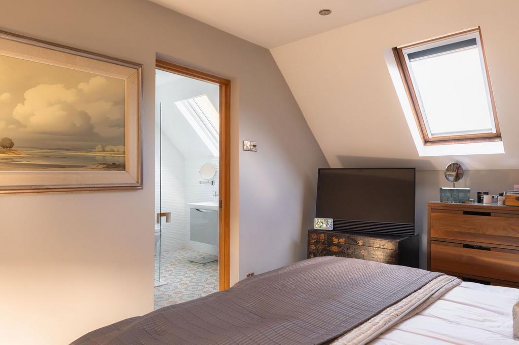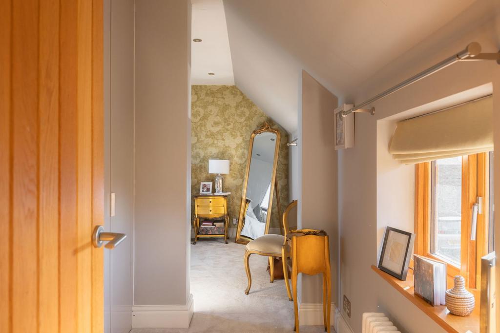 The formal sitting room, with its open fireplace and dual-aspect windows, offers a tranquil space for relaxation, while the family room, complete with custom-built bookshelves and a secret door which leads through to a hidden study, all adds an element of surprise and intrigue. A cloakroom and a discreet storage cupboard for coats complete the ground floor.