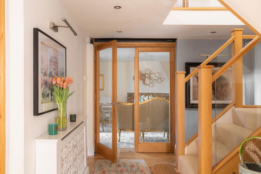 A wide, welcoming hallway leads into a dual-aspect kitchen and breakfast room, where an extensive range of units, complemented by elegant marble and granite work surfaces, offers both practicality and style. The addition of a butcher’s block further enhances the room’s style, while high-end appliances—including a five-ring gas hob and double oven—cater to the most demanding culinary pursuits. The dining area is spacious and light-filled, with a stable door that opens directly to the garden, creating a seamless connection between indoors and outdoors.