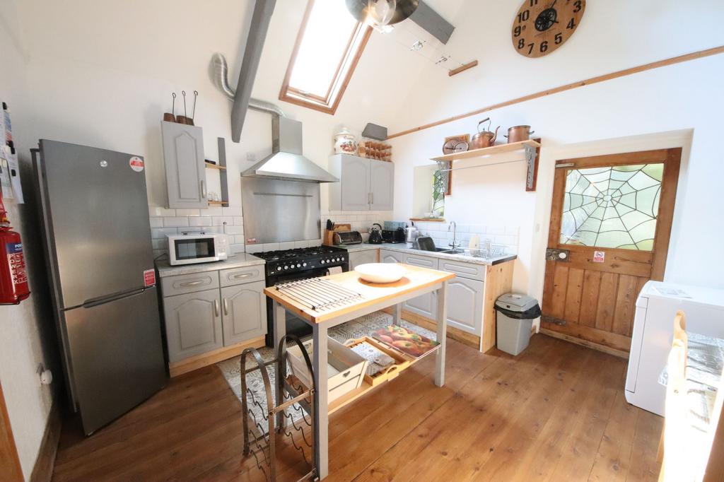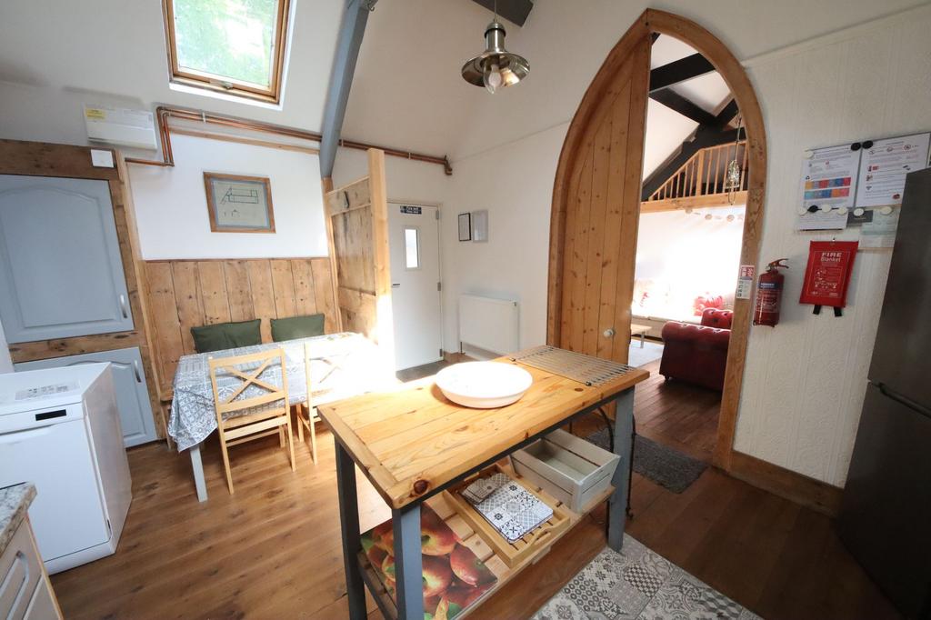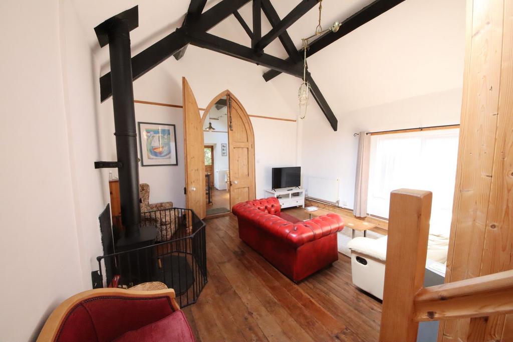A shared driveway leads down to the property from where a composite entrance door opens to the KITCHEN/BREAKFAST ROOM with vaulted ceiling and Velux window. Fitted with a range of units and work tops with inset sink unit. Range cooker with cooker hood above, space for fridge/freezer, breakfast area with built-in seating, natural wood floors and cupboard housing the gas fired boiler. UTILITY with provisions for washing machine, work top with inset sink unit and fitted shelving. From the kitchen tall arched wooden doors open to the SITTING ROOM with vaulted beamed ceiling with Velux window and further window overlooking the front approach. Slate hearth with wood burning stove and original natural wood flooring.