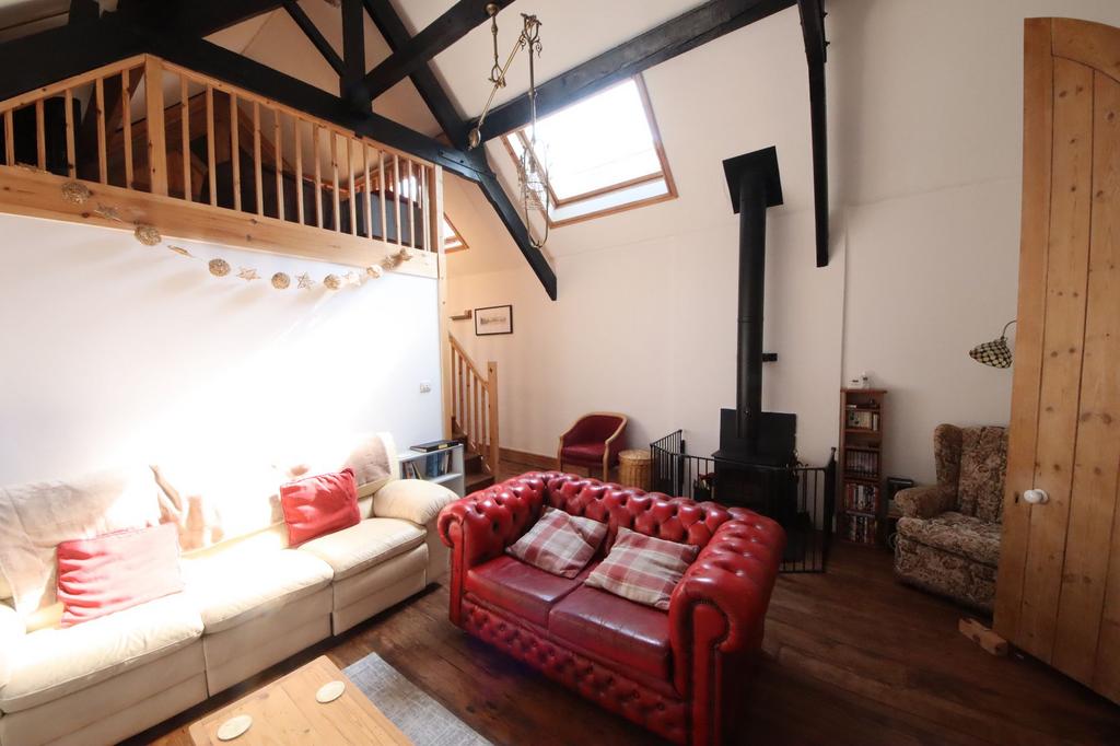 From the sitting room an INNER HALL leads off with Velux window and understairs storage. BEDROOM 1 with original natural wood flooring and window overlooking the front approach. BEDROOM 2 also with the original wood flooring and window to the front approach. BATHROOM with white suite of panelled bath with electric shower over, wash hand basin with cupboard under and WC. Ladder style heated towel rail and extractor fan. From the sitting room stairs rise to a MESSANINE AREA with character sloping ceiling and some reduced head height, currently used as a snug with access to storage room.
