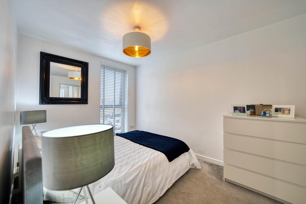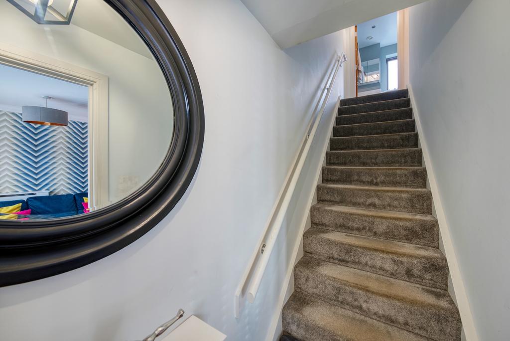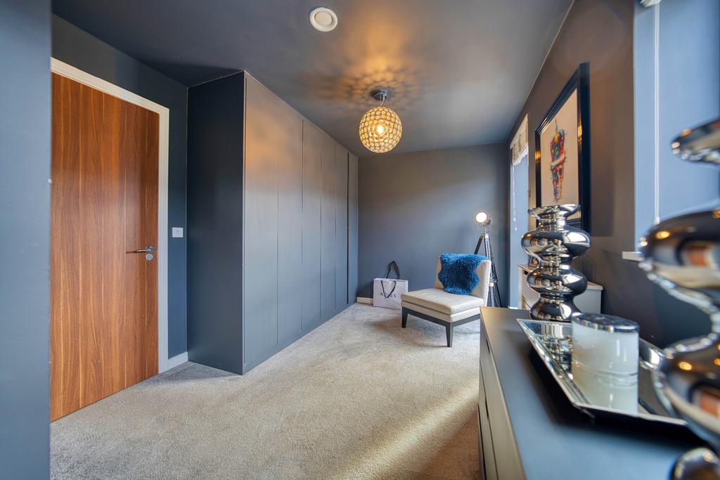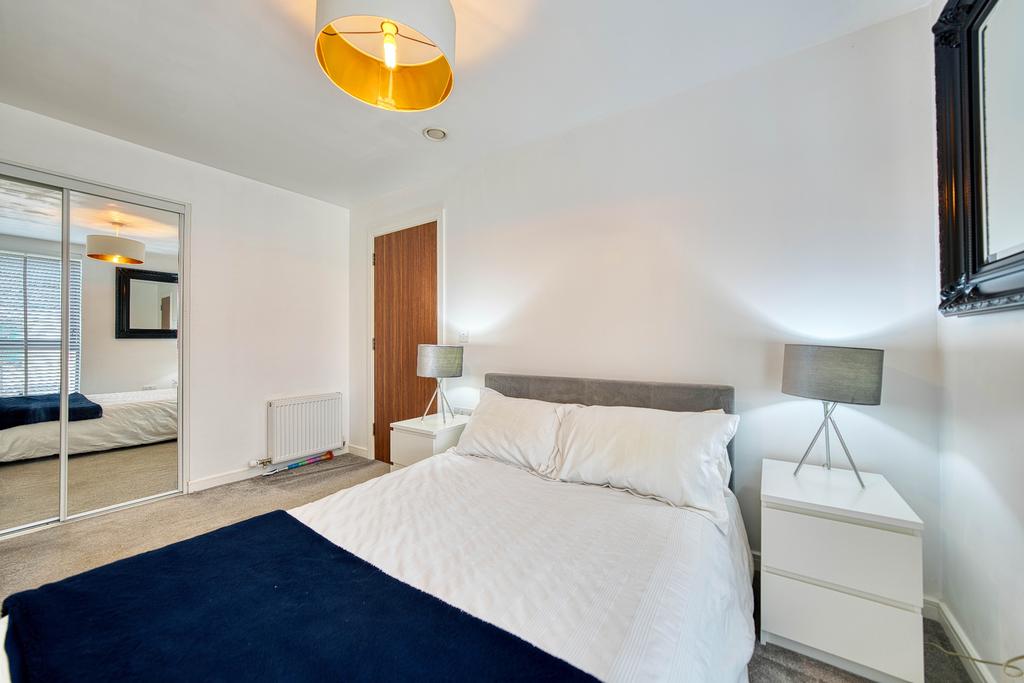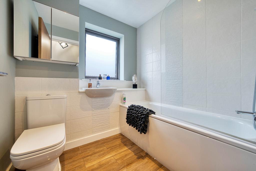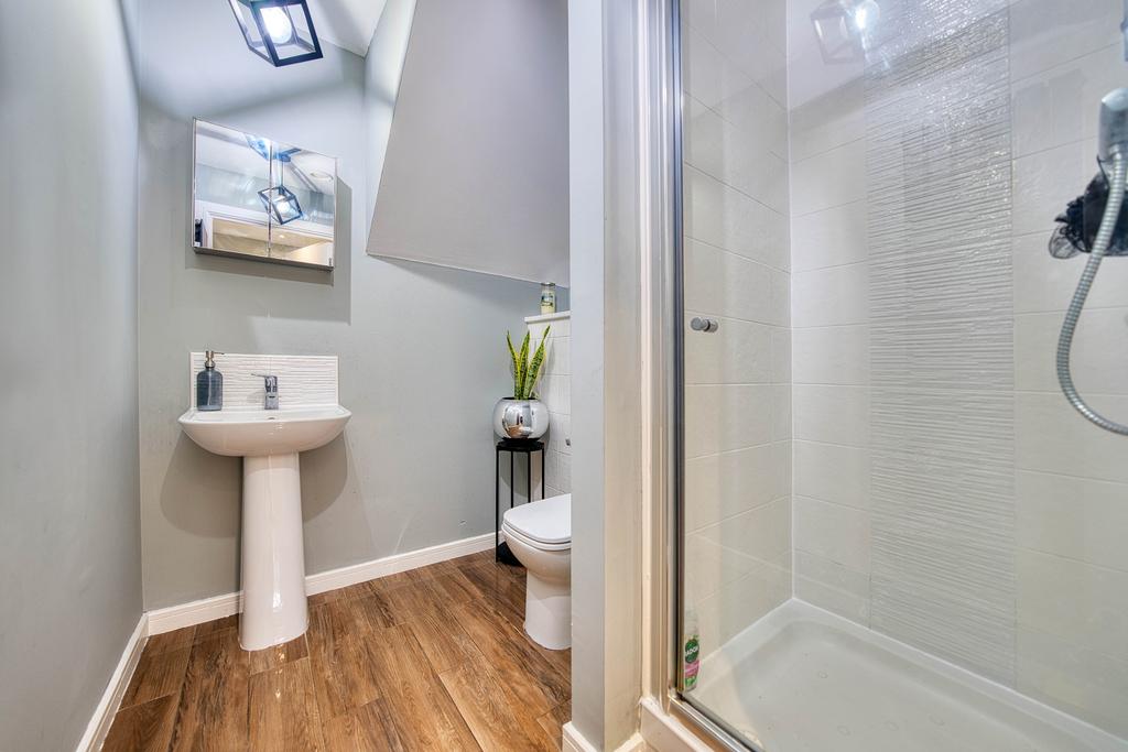 Upstairs, there are two well-proportioned double bedrooms, both featuring built-in storage and plush grey carpets. The stunning family bathroom is finished to the highest standard, featuring a luxury overhead rainfall shower, a glass screen, and sleek chrome finishes.