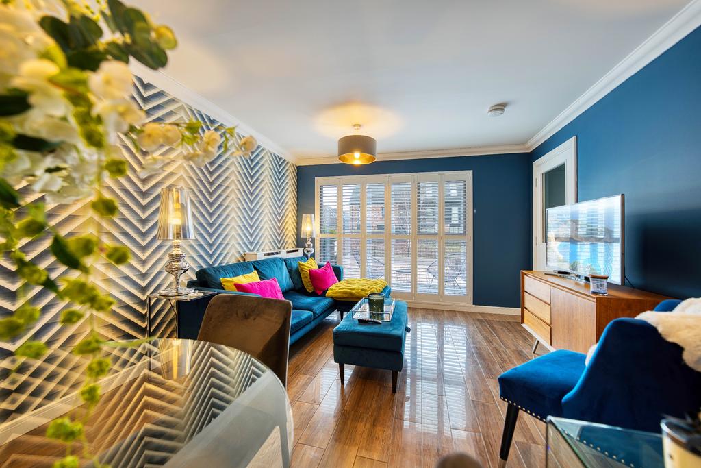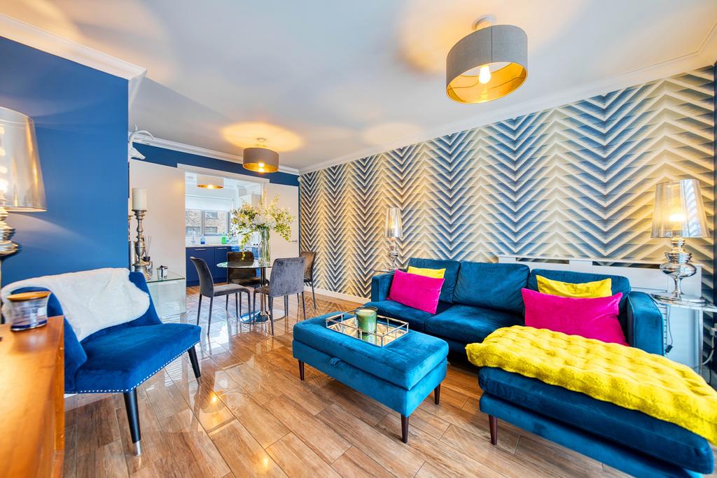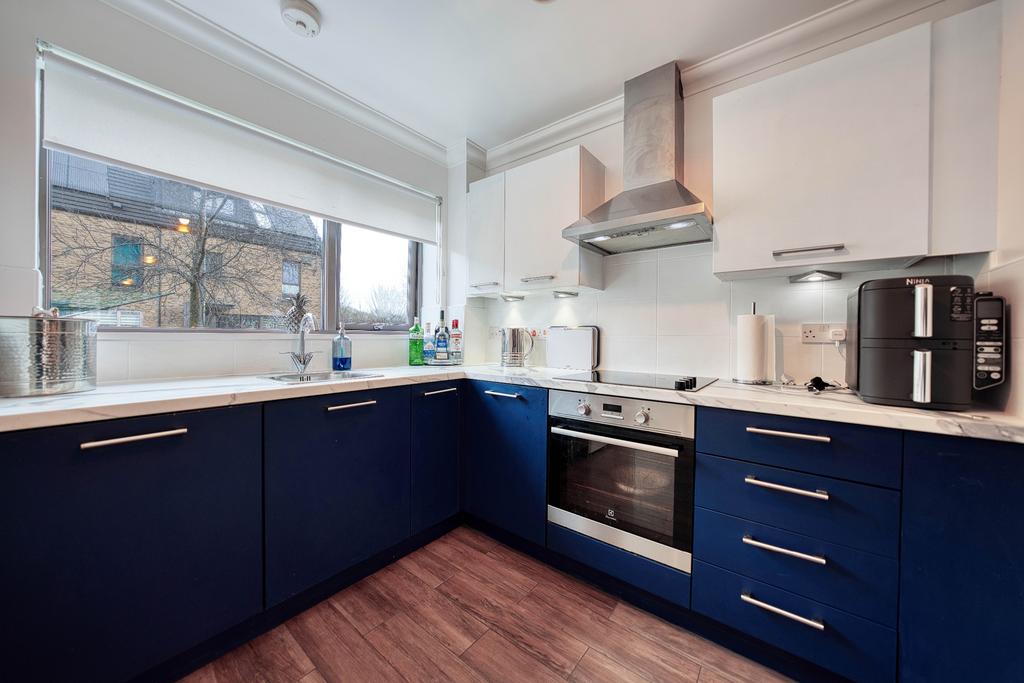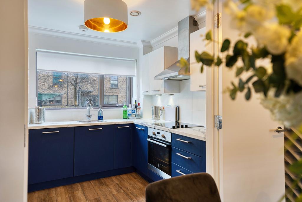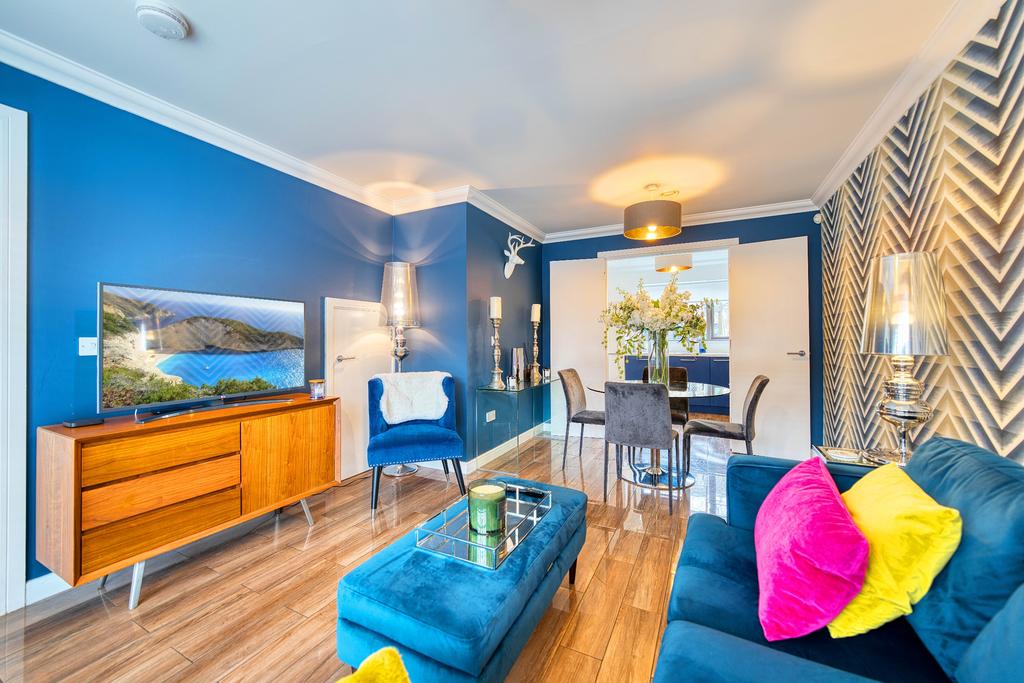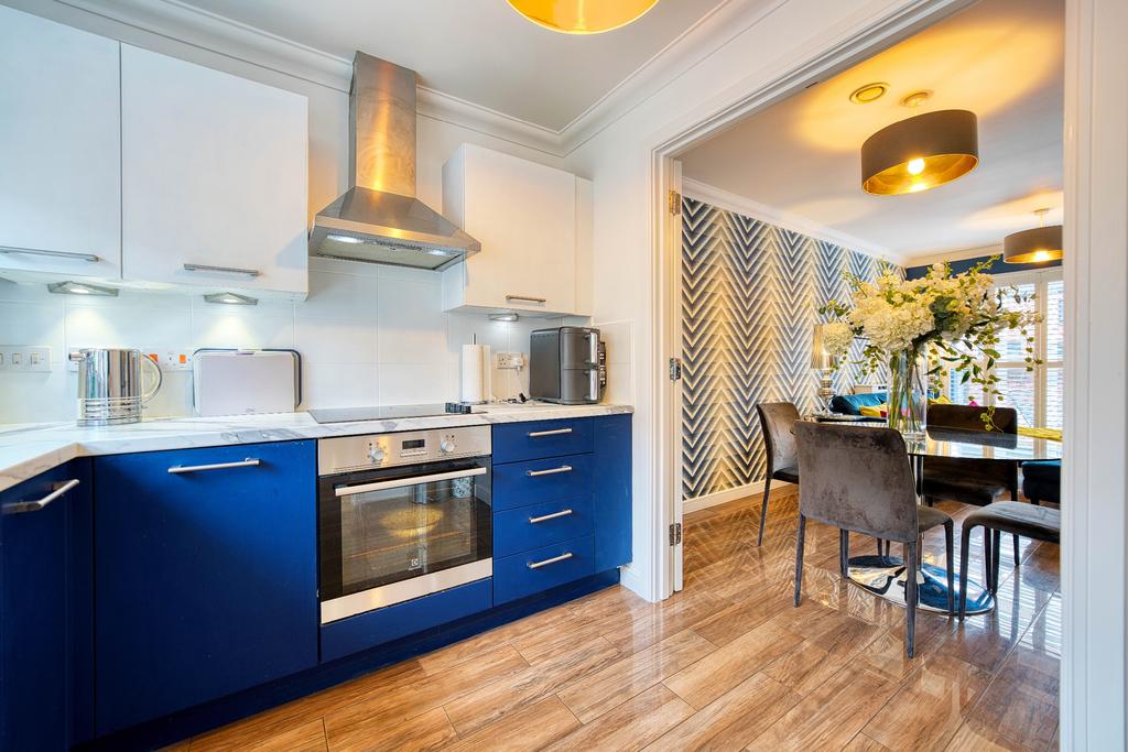 Upon entering, you are welcomed by a bright and spacious reception hallway leading to the impressive open-plan lounge and kitchen area, designed to maximise space and natural light. Floor-to-ceiling windows flood the room with natural light, creating a bright and inviting living space. The kitchen has been finished to an exceptional standard, boasting integrated appliances including a dishwasher, electric oven and hob, a chrome cooker hood, marble-effect worktops, and stylish tiled splashbacks.
