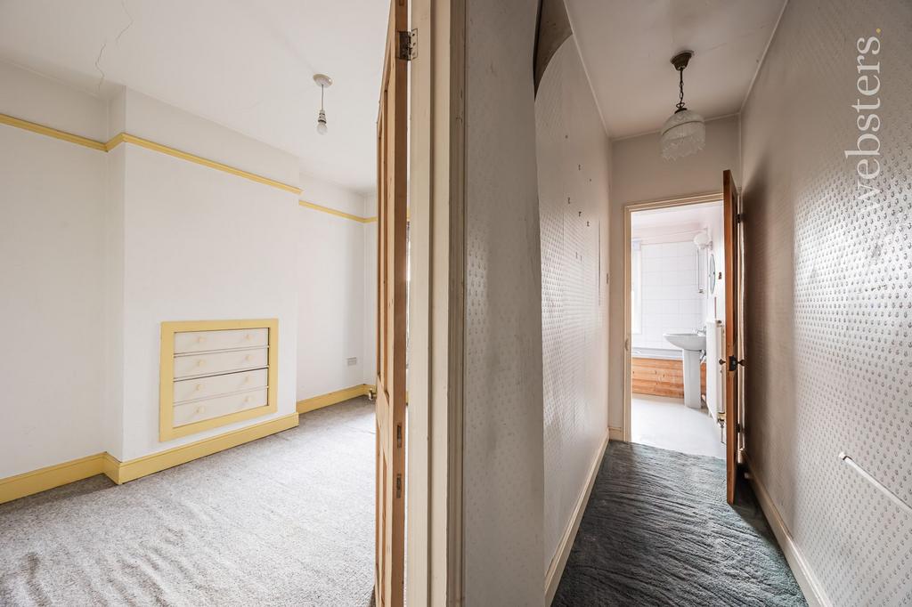 Doors to two bedrooms and bathroom, loft hatch, floor laid to carpet and a radiator.
