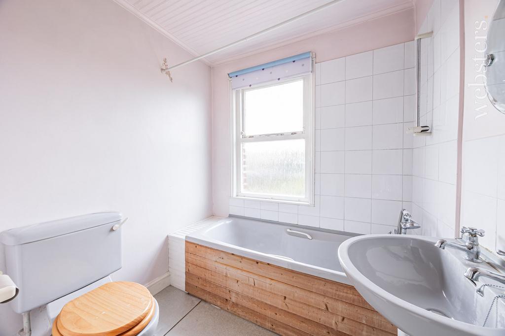 Panel bath with shower attachment and tiled backing, low set WC, pedestal hand wash basin with tiled splash back, radiator, airing cupboard, laminate flooring and an obscure casement window to the rear aspect.