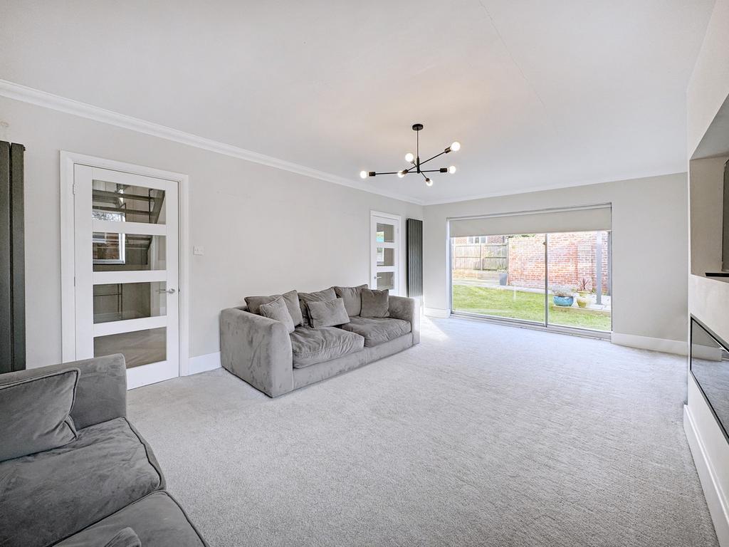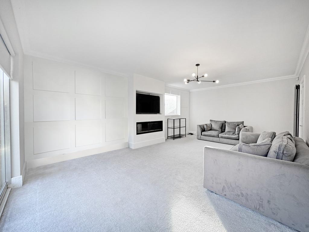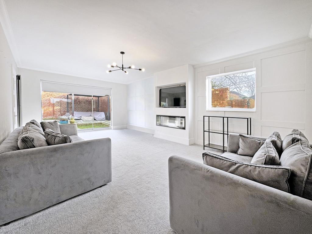 A grey metal framed doorway with full height glazing, to the right as you enter, leads through into a front snug or study, with a window to the front aspect. Adjacent to the snug, you’ll find a generously proportioned living room finished with asoft pale grey carpet, crisp white walls with feature panelling, in addition to a central media wall with recessed TV and landscape fire. Oversized sliding doors span the majority of the rear aspect, opening out onto the stone patio beyond.